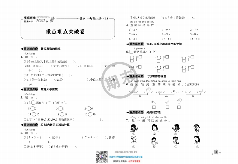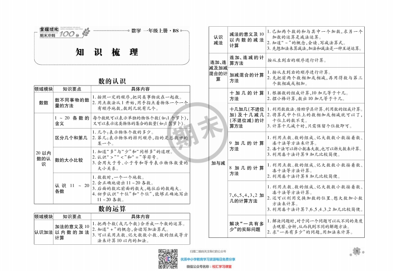 全程优化数学一年级上册·BSo1.已知两个数的和与其中一个加数,求另一个期末中利100丝认识减法的意义及10加数的运算是减法运算。减法以内数的减法计算2知道“一”的概念,会读、写减法算知识梳理先想加法来算减法,加法和减法是一种王逆运算。连加、连减的计连加、连算方法按从左到右的顺序进行计算。减及加减混合的计加减混合的计算1.按从左到右的顺序进行计算。数的认识算方法2,先把前两个数相加或相减,再用得数与第三个数相减或相加。领域模块知识要点具体内容十加几的计算1.根稀数的组成计算,10加儿等于十几数不同事物的数1,按照一定的顺序,把同类事物效在一起数。方法2.摆小捧计算,数出10加几等于十几。数数量的方法2.月点数法从1开始,用于指点着物条一个一个有顺序地数,数到几就有几个十几加几(不进位1.利用数数法,借助学具计算、利用数的组咸计算。1~20各数的每个数既可以表示单盘的骑体个数(如:个萝卜)加)及十几减几2.辨算式中个位上的数相加我相减就可以了,十位上的段不变。含义又可以袁示这吴撕依的集合的数量(如:山信萝卜)不退位减)的计算方法3.计算十儿域十时,只需保留个位数即可1.几个:表示物体个数的多少区分几个和第几2,第几:表示物体的排列顺序,指的是总数中的1,利用点数、级的组成、记大数数小数接着级、某一个。9加几的计算凑十法等方法来计算。20以内1.知道“多”与“少”和“同样多”的道理方法2.凑十法可以浙小数凑大数,也可以拆大数来计算3.利用凑十法计算9加几比校简便。数的认数的大小比较2.认识“>”“<”和“=”等林号。识3.会用大于号、小于号和等号表示物体数量的加与减1利用点数,数的组成、记大数数小数接着数大小关系。8加几的计算方法凑十法等方法计算。1.数级时,一个一个地数。2,利用凑十法计算8加见比较简便认识11w202.会正确地埃出11-20各数各数3.后面的数比前面的数大,越往后的数越大1.利用点数,数的组成、记大数数小数楼着数、4.韧多认识“十位”和“个位”,能够正确地写出7,6、5、4,3、2加凑十法等方法计算。11-20各数。几的计算方法2,还可以利用交换加数的位置,想大最加小数方法来计算。数的运算3,利用凑十法计算76.54、32加几比较简便领域模块知识要点具体内客加法的意义及101.把两个级(或几个数)合并成一个数的运算。解决“一共有多1.解决问题时,对于间一个问题可以从不可的角度认识加法以内数的加法2.知道“+”的概念,会读写加法算式少”的实际问题去境察,分所,从而找到不同的解遵方法。2,求“一共有多少”的问题,用加法来计算计算3.可以采用点数、记大级数小数、数的姐成等方法来计算10冰内的加法。日量一加铜关注我的公众号第。优场中小学育学习德遵每日党因分享微增公众号名常:校汇学习课理