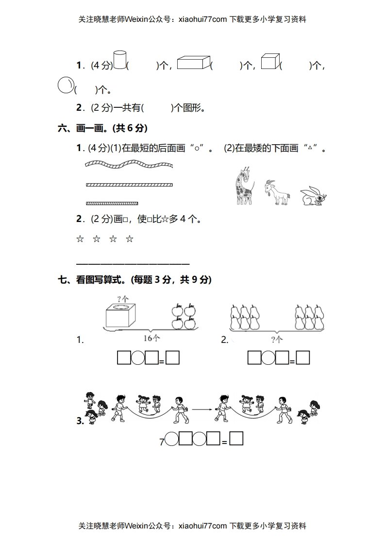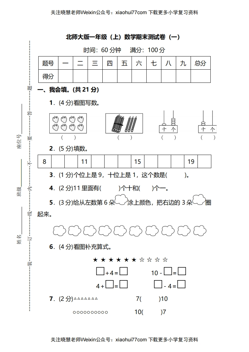 关注晓慧老师Veixin公众号:xiaohui77com下载更多小学复习资料北师大版一年级(上)数学期末测试卷(一)时间:60分钟满分:100分题号三四五六七八九总分得分我会填。(共21分)1.(4分)看图写数。商个p(2.(5分)填数。8111519++++3.(1分)个位上是9,十位上是1,这个数是()。4.(2分)11里面有()个十和()个一。5.(3分)给从左数第6朵涂上颜色,把右边的3朵J起来。毁6.(4分)看图补充算式。★★★★★★☆☆☆☆☐+4=☐10-□=☐4+☐=□□.4=□7.(2分)△△△△△△△7()10000000000010()7关注晓慧老师Veixin公众号:xiaohui777com下载更多小学复习资料