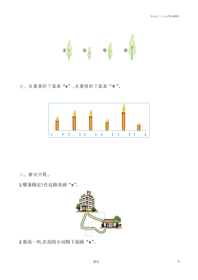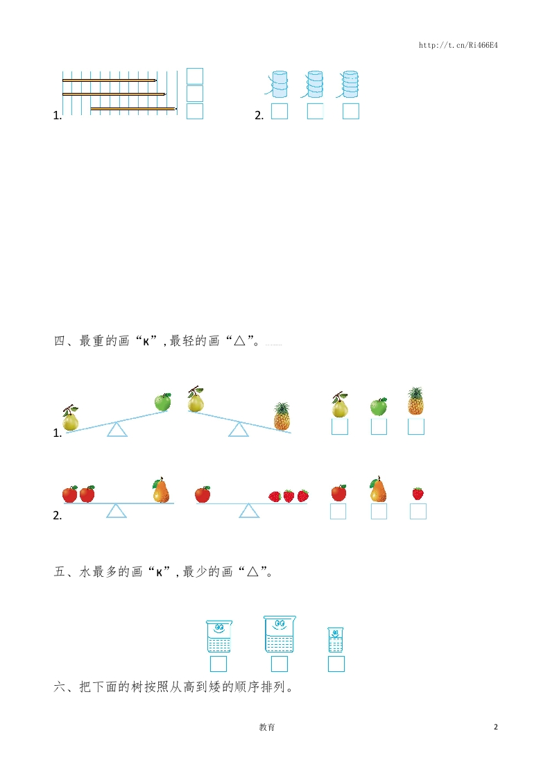 http://t.cn/Ri466E4第二单元测试卷一、画一画。1.长的画“K”,短的画“○”。技爱2.高的画“k”,矮的画“O”。学13.重的画“K”,轻的画“O”。二、比一比。1.最高的画“K”,最矮的画“△”。2.最厚的画“△”,最薄的画“○”。三、最长的画“K”,最短的画“△”。教育