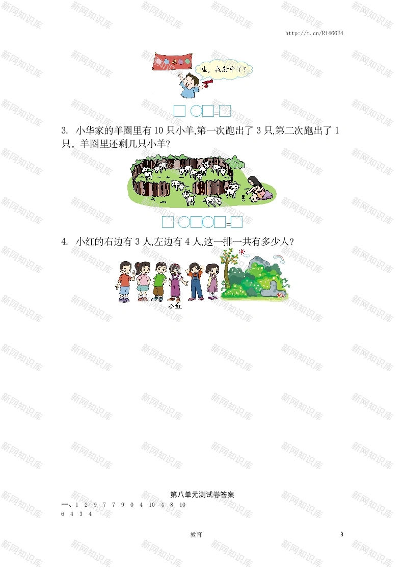 http://t.cn/Ri466E4第八单元测试卷一、算一算。10-9-7-0-0+1010-4一9-7=5+4=8-4=9-5=3+6=8-8=6+2=10-7=4十3=6-2=7+3=7-3=二、想一想,填一填。1.在○里填上“+”或“-”。5○2=710○6-48○0-89○2=72.照样子填数。23.在()里填上合适的数。6-()=47+()=106=9-()10=4+()4+()=99-()=3三、直接写出得数。2+1+7=6+4-5=8-4+3=2+2+67-2-3=9-7-0=4+5-3=8-6+7=四、比一比。⊙3©54+2○73+7○109-6○46+1○4+47-0○0+77-5○8-64+3○10-210-3-3○32+7-3○5教育