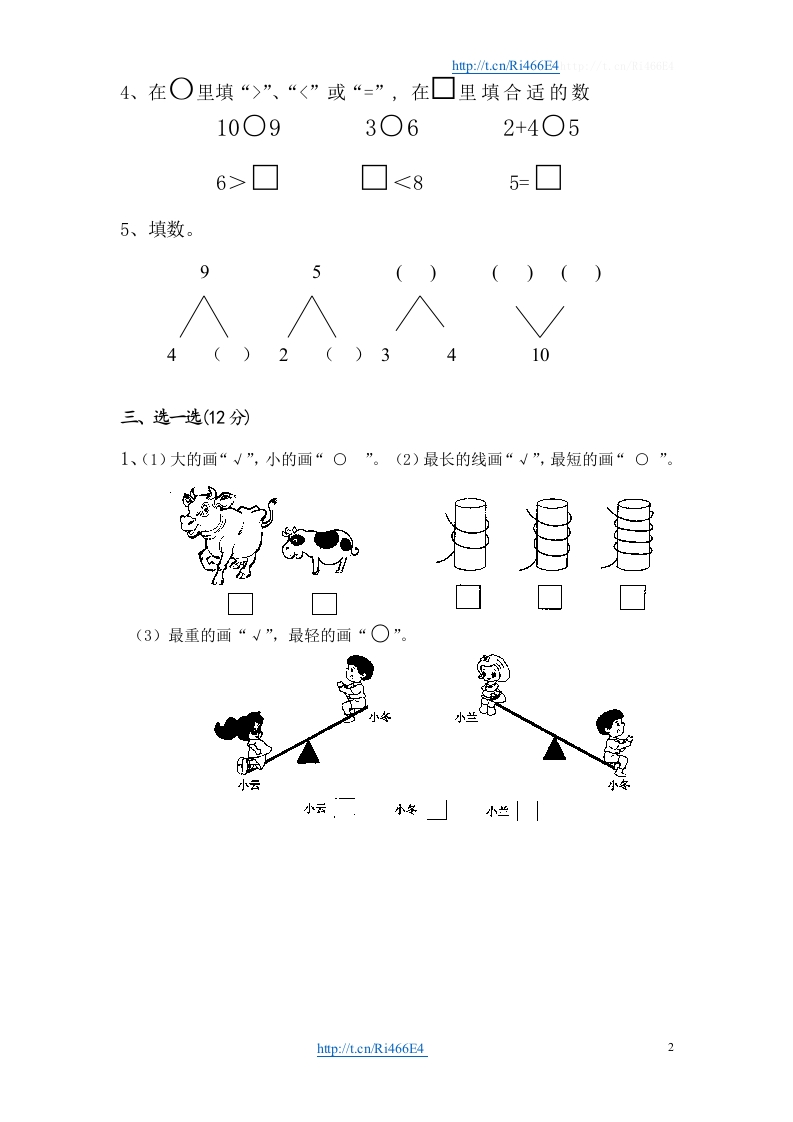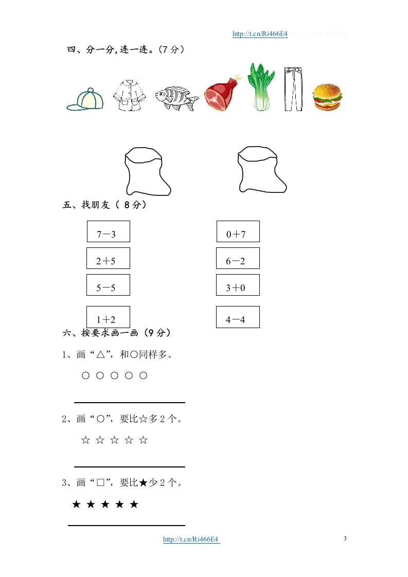 http://t.cn/Ri466E4苏教版第一学期期中检测试卷小学一年级数学试题考试时间:40分钟考试形式:闭卷卷面总分:100分学校:班级:姓名:得分:一、直接写出得数。(20分)7-4=2+3=5-4=4-0=3+4=4+2=7-3=0+7=6+1=6-3=4-2=5+1=3-2=2+2=7-46-6=2+5=4-3=7-2=0-0=二、填一填。(28分)1、看图写数。)颗(1)一共有()个图形,其中有()个(2)⑤的左边有()个图形,右边有()个图形。3、在口里填上合适的数1238(1)上面的数中最大的是(),与4相邻的数是()和((2)比7大,比10小的数有()个。http://t.cn/Ri466E4
