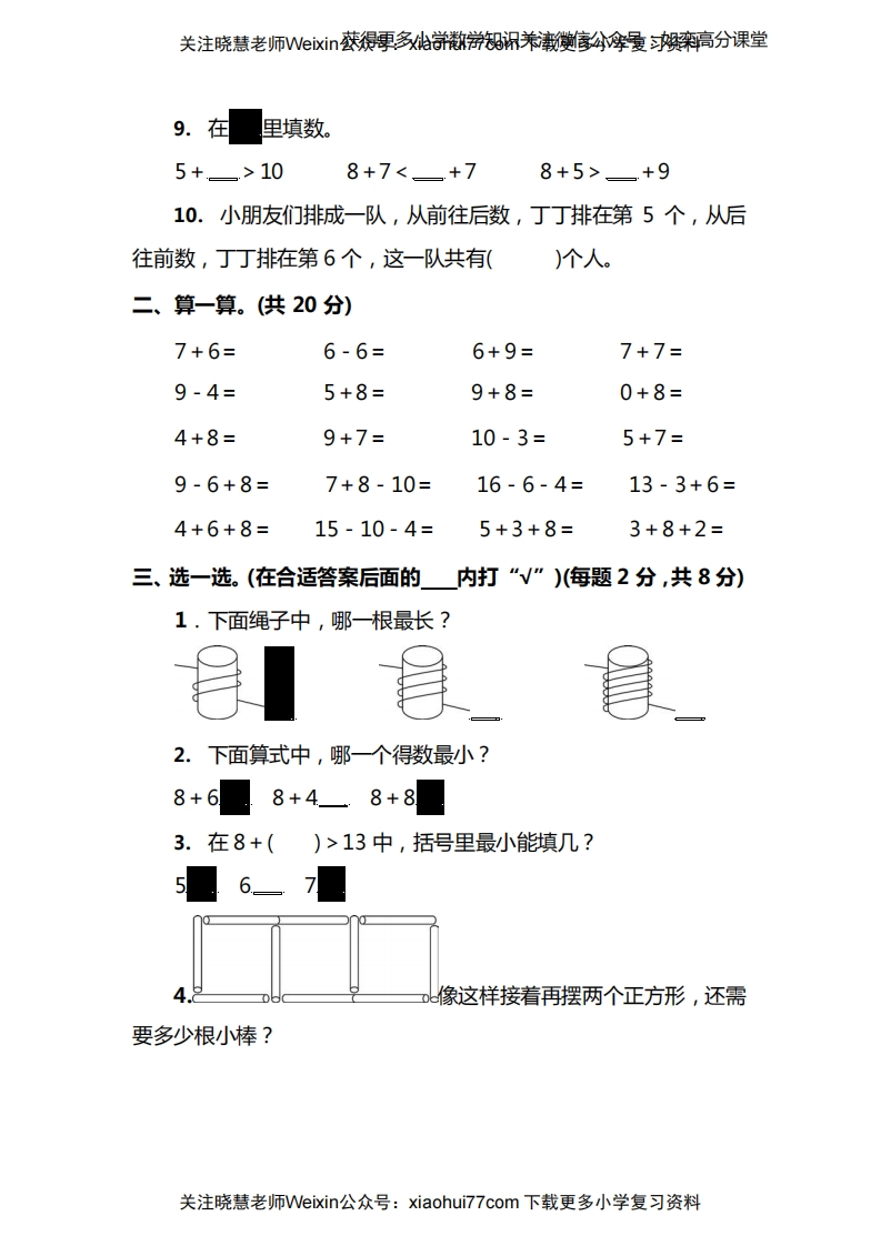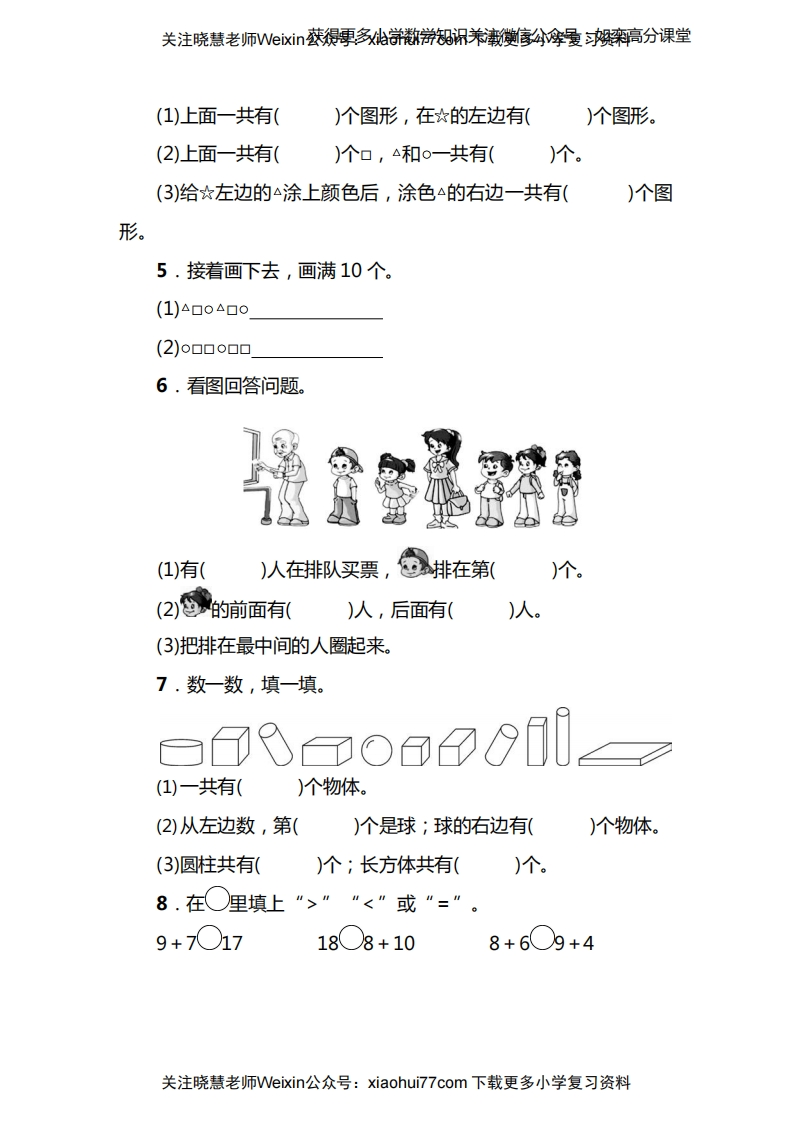 关注晓慧老师Wexi获得更,多款游知闲养衡宝分摩量高分课堂苏教版一年级(上)数学期末测试卷(一)时间:60分钟满分:100分题号四五总分得分一、填一填。(每空1分,共46分)1.先填好里的数,再回答问题。111214☐1618(1)上面的数中,最接近18的数是()和((2)16里面有()个一和()个十。2个十是((3)上面数中,最大的是(),最小的是(2.看图写数,再比较大小。3.数数填填。送送送送快楼送送送@@炮桓包桓有)只,@有)只2,比@多只和@-有()只。4.□△O☆☐△O△□O关注晓慧老师Veixin公众号:xiaohui77com下载更多小学复习资料