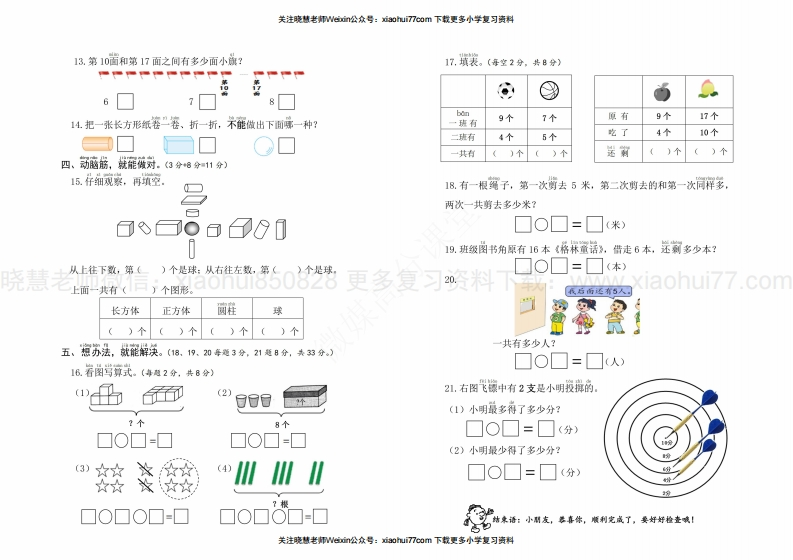 关注晓慧老Wein公众号:i3ohui77com下载更多小学复习资料苏教版教育集团2019一2020学年度5.在○厘城上“>”、“<”、“=”,第一学期一年级数学期末检测试卷6○810○56*5○5+6◆瓶人)是芳审植人?黄保你等第199○169+6○5+818-10(○10-2氡首语:小相应们,经过一零期的梦力,弹们一定有悬多煮藏!让我们认真思考。加6.按规律填数。(第2小通3分)心等超,事受成功的春悦吧!一,细心或,就能算对。(2分)(11715131.直接写出符数。〔16分)9+8=5+9=14-4=9-3+6=2)1-0=18-8=8+5=9+7-10=6+9=9+9=99=17-7-3=0+7=13-10=6+7=3+5+4=?.圆出()里的正谛荟案2.短一想,埔一填。(年题1分,共6分,)小男孩的(左,右)手章着气球,小女孩的(左、右)手拿着风车。6+()=10)=7+810()>7(5)+6=16()+8=14Q5+(Q)=12更多复习资料aohui77.com二、认直想,就能填对。《年空1分,第6(2)通3分,夫23分)3.看图号数。8△+△=16,△=5,△=(.2=(9.书架上放了9本书,从左数起,小宁套走了第3本,书架上还刺(》本书三、细比较,正编的司“”。《峰题1分,共5分)10,郑一种水果最重10☐12131718(1)在口里城上合适的数。(2)13和18中,()接近10,()接近20。11.罩一根线最长?(3)17里面有()个十和()个一(4)()蒂上1是20,20里面有()个十.目口(5)一个两位数,比20小,而苴个位和十位上的数相同,这个12.手势表示几?得分:数是()表示2☐表示6☐表示8关注晓慧老Wen公众号:i3ohui77com下载更多小学复习资料