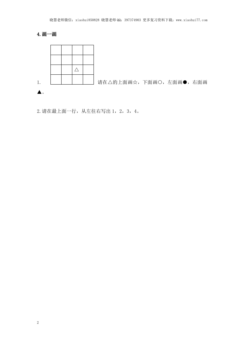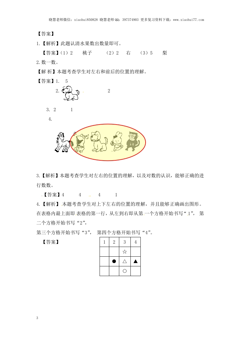 晓慧老师微信:xiaohui850828晓慧老师QQ:397374903更多复习资料下载:"m.xiaohui77.com苏教版一上同步课课练4.2认位置1.分左右。的d。(1)从左数苹果排第(),它的左边是()。(2)香蕉的左边有()种水果,梨在它的()边。(3)上面共有()种水果,从右数第二个是.()。2.数一数。1.一共有()只小动物。2.从左数()排第排第(前面有()只小翔:后面有()只小动物。4.从右边起圈出4只小动物。3.看一看,填一填。从上图左边数起,第2个.鱼缸里有5条鱼,第5个鱼缸里有()条鱼:有2条鱼的是第()个鱼缸,它右边一个鱼缸里有()条鱼,左边一个鱼缸里有()条鱼。1