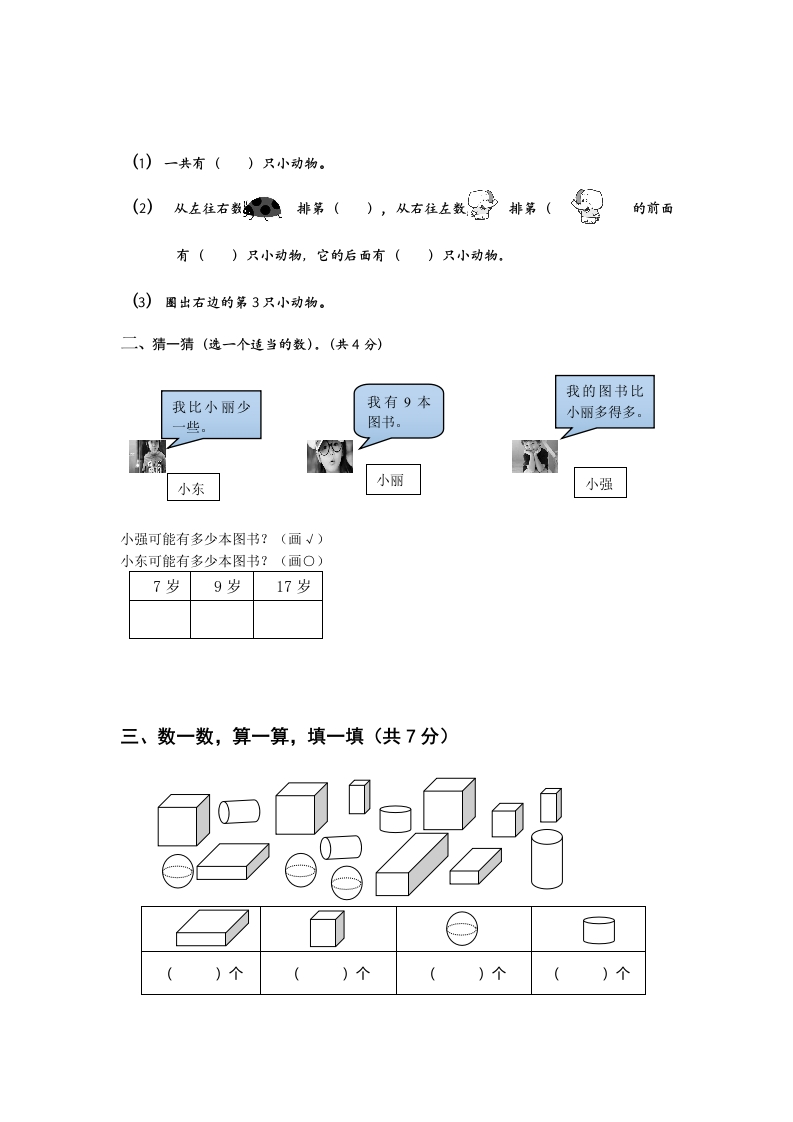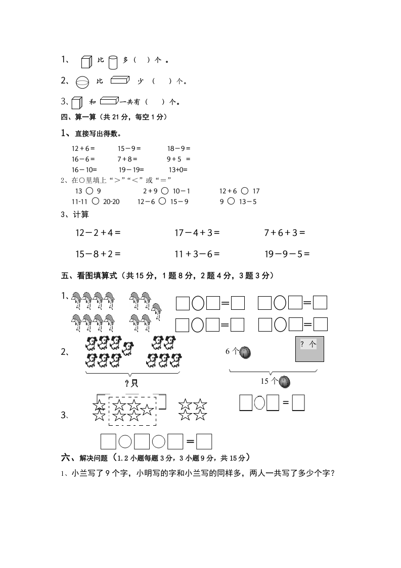 2020年秋期西师版小学一年级数学上册期末试卷xmtt884个月前发布关注私信2.64MB4页0498 第1页 / 共4页 第2页 / 共4页 第3页 / 共4页 试读已结束,还剩1页,您可下载完整版后进行离线阅读 2020年秋期西师版小学一年级数学上册期末试卷此内容为付费资源,请付费后查看¥1¥2会员服务免费立即购买您当前未登录!建议登陆后购买,可保存购买订单付费资源© 版权声明文章版权归作者所有,未经允许请勿转载。THE END数学 文本预览 一年级数学小朋友,这学期你一定学会了很多数学知识。相信你一定能解决下面的问题,加油!要快乐填空。(共38分。每空1分)1、看图写数。群十个181083、5个一和1个十组成(),和它相邻的数有()和()。4、比8大6的数是(),比8小6的数是()。5、20里面有()个十;也可以说20里面有()个一。6、小朋友们排队做操,小华前面有9人,后面有8人,这队一共有()人。7、按规律填数。59111713 查看更多 收起部分 喜欢就支持一下吧点赞8 分享QQ空间微博QQ好友海报分享复制链接收藏