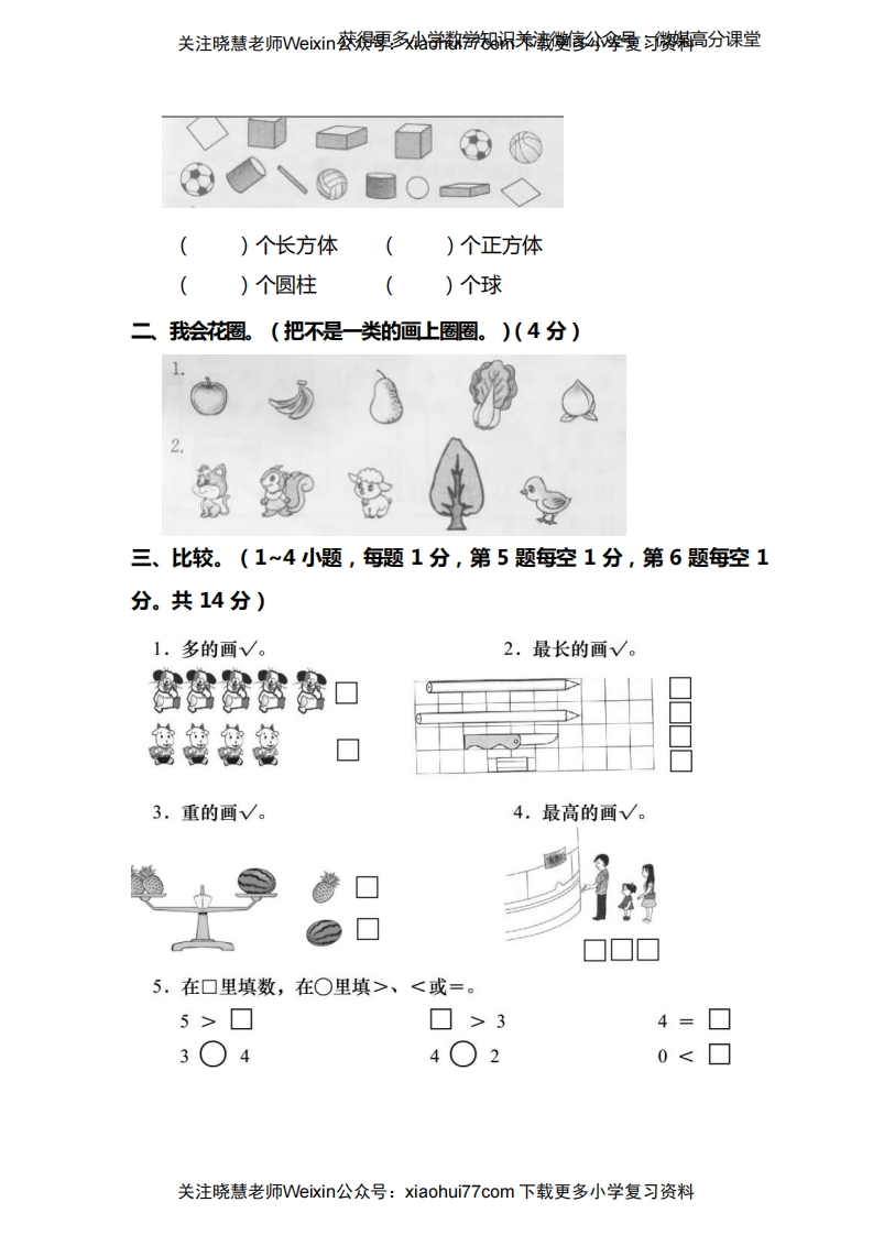 关注晓慧老师Weiⅸi获得更多讲数游知识德公,厦习高分课堂西师大版一年级(上)数学期末测试卷时间:60分钟满分:100分题号三四五六七总分得分一、我会填。(每空1分,共29分)1、看图填数。000000000000位位位位)(2、12口10长10310738910、4、24、数一数,填一填。()个一和()个十是()()个十是()()个十和()个一是()阳学5、看图填空,再比大小。()个()个()o()6、仔细数一数,填一填。关注晓慧老师Veixin公众号:xiaohui777com下载更多小学复习资料