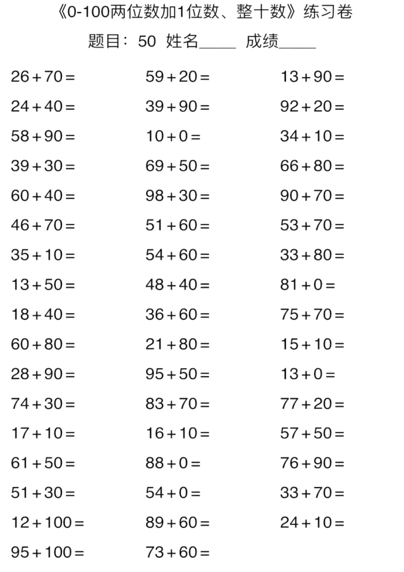 《0-100整十数加、减整十数》练习卷题目:50姓名成绩50-40=80+40=70-20=30+20=40+20=100+100=60+50=20-10=90+70=80-20=100-0=20+40=40-0=90+80=30-0=50+80=30+90=60-20=90-10=30+0=40+100=30+30=40+90=30-30=70-0=20+0=50-0=10-0=40-20=90-0=70-30=30+60=10+30=100+0=20+30=70+100=10-10=70-10=60-10=30+80=50-30=60+90=50+30=50-50=20+80=70+40=50+90=10+80=30+40=50-20=