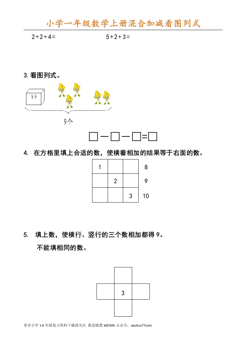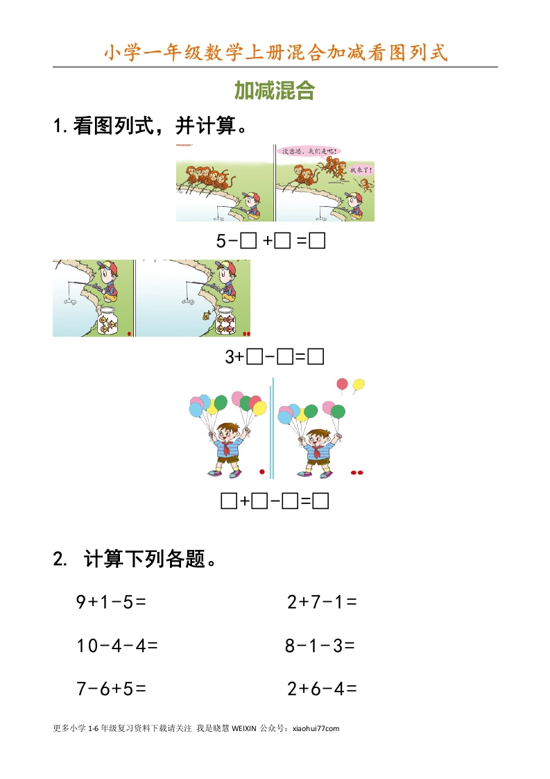 小学一年级数学上册看图列式xmtt884个月前发布关注私信1.03MB12页0399 第1页 / 共12页 第2页 / 共12页 第3页 / 共12页 试读已结束,还剩9页,您可下载完整版后进行离线阅读 小学一年级数学上册看图列式此内容为付费资源,请付费后查看¥1¥2会员服务免费立即购买您当前未登录!建议登陆后购买,可保存购买订单付费资源© 版权声明文章版权归作者所有,未经允许请勿转载。THE END数学 文本预览 小学一年级数学上册混合加减看图列式连加连减1.看图列式,并计算。2+☐+☐=□□+□+□=□7677孓10-□-□=□2.计算下列各题。3+4+1=7+2+1=6+4+0=4+3+2=9-4-1=8-2-5=6-3-3=4-1-2=更多小学16年级复习资料下载请关注我是晓慧WEIXIN公众号:xiaohui77com 查看更多 收起部分 喜欢就支持一下吧点赞9 分享QQ空间微博QQ好友海报分享复制链接收藏