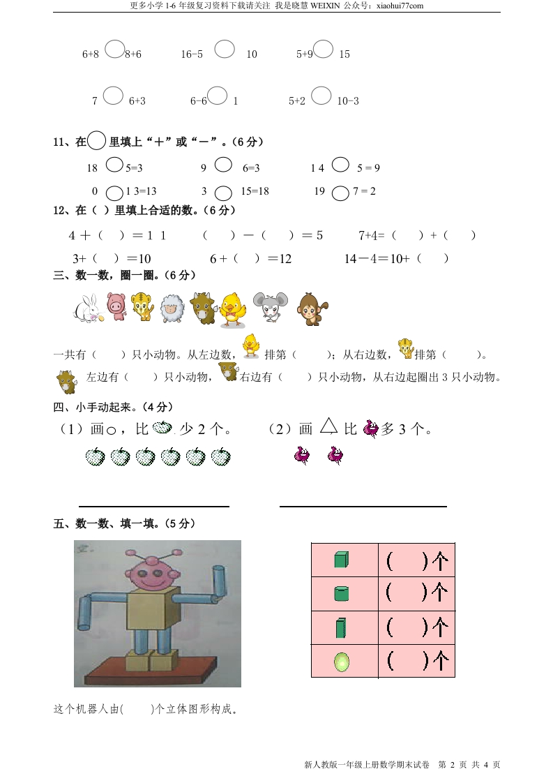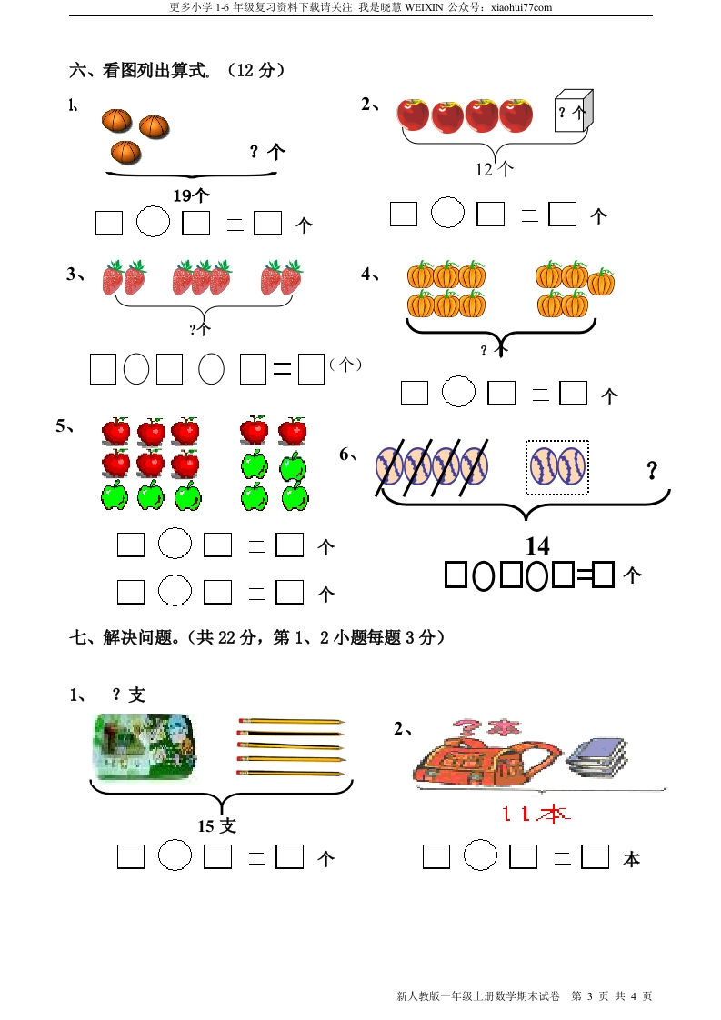 更多小学16年级复习资料下载请关注我是晓慧VEIXIN公众号:xiaohui77com一年级上册数学期末试卷学校:班级:姓名:题目二三四五六七总分得分一、我会算。(15分)9+8=13+6=13+6=7+5=11+5=10+5=6+8=18-8=10+5=4+9=6+2+7=8+7一3=9-0-2=10-9+8=20-10+4=二、我会填。(36分)1、我比7大6,我是()。2个十是()。2、1个十和5个一合起来是(),再去掉5就是()。3、16在()和()中间,4、19的前面是(),11的后面是()。5、从右边起,第一位是4,第二位是1,这个数是()。6、今天我从第10页读到第14,明天该读第15页了。他今天读了()页。7、按规律填数:(2分)1518121048、写一写,画一画。(3分)十位个位十位个位十世个位()6209、写出时间(3分)36565)时()时()时过一点10、在里填上“<”、“>”或“=”。(6分)新人教版一年级上册数学期末试卷第】页共4页