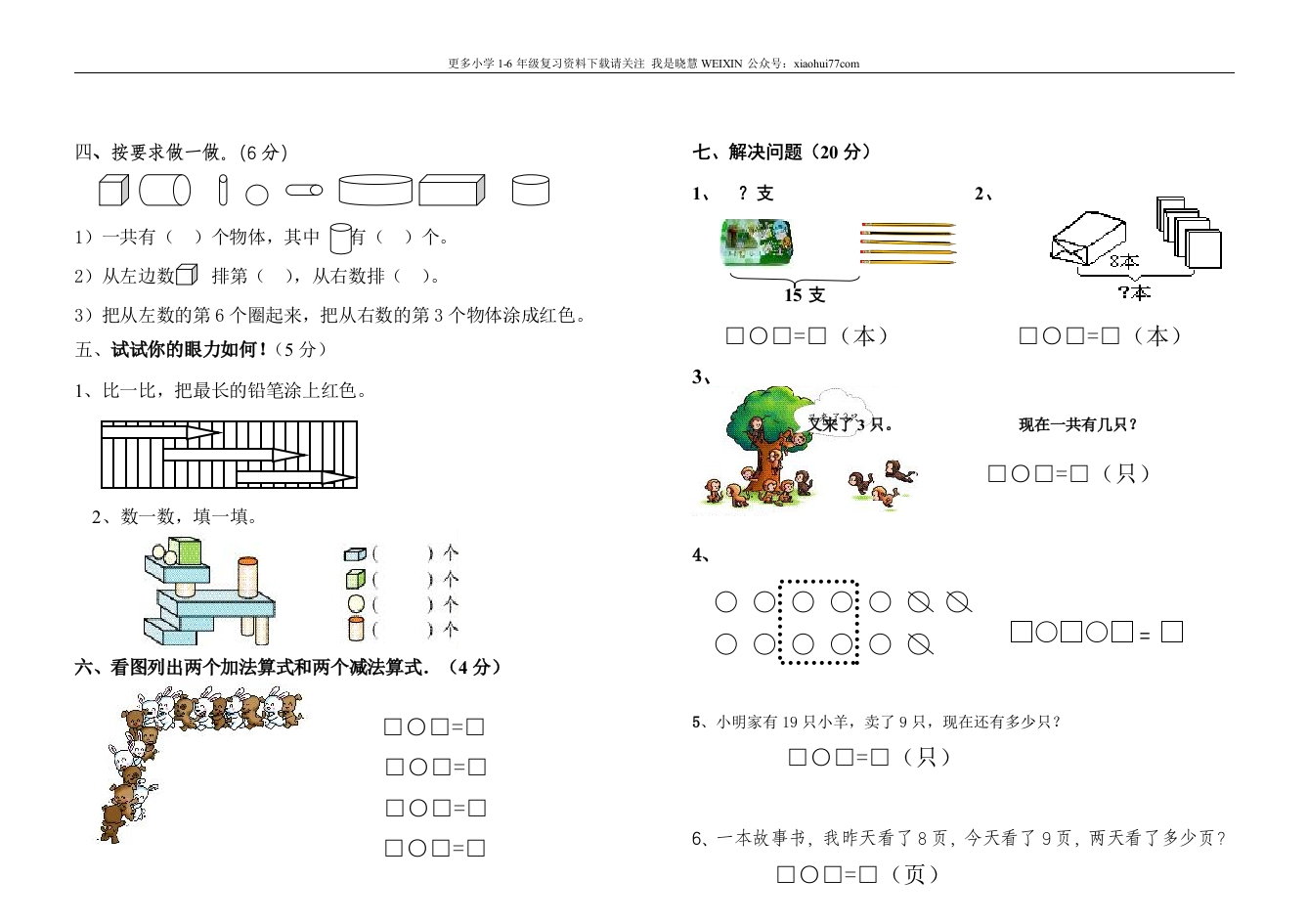 更多小学16年级复习资料下载请关注我是晓慧WEIXIN公众号:xiaohui?77com一年级上册数学期末测试卷7、写出两道得数是10的算式☐○☐=口口O口=口(时间:60分钟)8、在○里填上“十”或“一”一、看谁算得又对又快。(17分)3+9=5+9=4+7=4+2=14○4-1016○4=208○7<912>6○56+9=12-10=8+8=18-3=9、在()里填上合适的数。5+7=2+8=4+3=0+10=4+()=11()一()=57+4=()+()14-4-3=4+0+6=8+9-3=5+6=()+3=()+()16-10+4=3+9+5=阿三、数一数,涂一涂,圈一圈。(16分)二、填空(32分)1、15里面有()个十和()个一,这个数在()和()1的中间。2、2个十是(),10里面有()个一。in3、一个数的个位上是0,十位是2,这个数是(),它在()批的后面。4、按规律填数:()8()()11()()()个()个()个()个152、☆☆☆☆★☆☆☆☆☆☆☆☆☆☆☆☆☆5(1)一共有()个五角星。(2)将左起的第8个☆涂上红色。223(3)★在左起第()个。.65652日5(4)第8个☆的右边有()个☆大约是()时(:)大约是()时()时3、把不同类的用“O”圈起来。6、在○里填上“<”、“>”或“=”。9-3○911+4○1514+4○11+27○6+36-6○123+9○5+7苹果梨香蕉萝卜