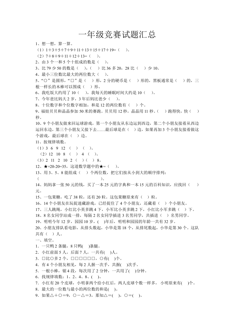 一年级竞赛试题汇总1、想一想,算一算。(1)1+3+5+7+9+11+13+15+17+19=().(2)7+8+9+11+12+13=()。2、由3个一和5个十组成的数是()。3、比79少50的数是(),()比36多20,28比()少10。4、最小三位数比最大的两位数大()。5、“O”是圆形,“口”是()形,2分的硬币是()形的,黑板通常是()的,三根一样长的木棒可以围成()形。6、我吃饭大约用了10(),我每天的睡眠时间大约是10().7、今年爸比妈大2岁,3年后妈比爸少().8、十位数字和个位数字相加,和是12的两位数有()个。9、福娃贝贝和晶晶参加50米的赛跑。贝贝用12秒,晶晶用11秒。()跑得快,快()秒。10、9个小朋友做来回运球游戏,第一个小朋友从东边运到西边,第二个小朋友接着从西边运回东边,第三个小朋友又接下去.最后球是在()边,如果再加3个小朋友接着做这个游戏,最后球在()边。11、按规律填数。(1)36912()().(2)12108()4().(3)2112102()()8。12、★+20-20=35,这道数学题中的★=().13、用3、5、8能组成()个两位数,把它们按从小到大的顺序排列:)。14、妈妈拿一张50元的钱,买了一本25元的字典和一本15元的百科知识,应找回()元。15、一包果糖,吃了38粒,还有20粒。这包果糖原来有()粒。16、14个小朋友在玩捉迷藏游戏,己经捉住了4个小朋友,还藏着()个小朋友。17、三人跳绳,小红比小英多跳4下,小军比小英多跳2下,小红比小军多跳()下。18、8名女同学站成一排,每隔2名女同学插进3名男同学,共插进()名男同学。19、明明今年12岁,园园10岁,()年后,明明和园园的年龄一共有32岁。20、小朋友排队看电影,从排头数起,小华是第18个,从排尾数起,小华是第30个。这队共有()人。一、填空。1.一只鸭2条腿,8只鸭()条腿。2.小红前面5人,后面7人,一共有()人。3.口比O多2个,口口口口口口,O有()个。4.有4个小朋友相见,每2人握一次手,共握()次手。5.一根小棒,锯4段,每次用了2分钟,一共用了()分钟。6.找规律填数:1、2、4、8、()。7.小红有20个皮球,小明拿两个给小红后,两人皮球个数一样多,小明原来有()个。8.最大的一位数与最小的两位数的和是()。9.如果△十O=9,O一△=3,那知△=(),0=()
