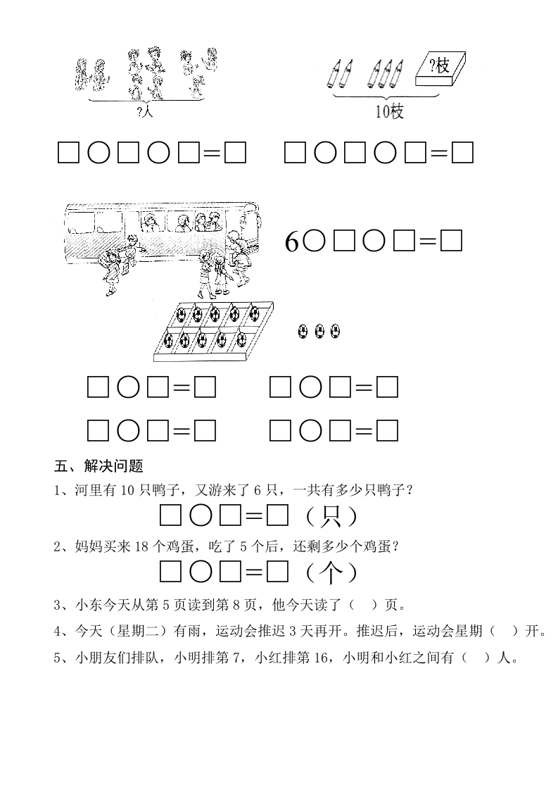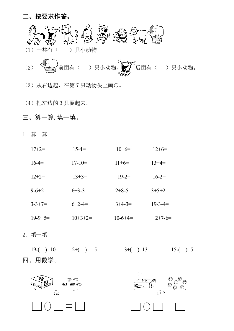 一年级上册数学第六单元测试卷姓名:班级:一、填一填。1、按顺序填数。91217142、看图写数。鑫十位个位读作:写作:读作:写作:3、14里面有()个十和()个一。4、1个十和9个一组成的数是()5、20前面的数是(),15后面的数是()。6、从右边起,第一位是()位,第二位是()位。7、2个十是(),15里面有1个十和()个一。8、十位上是1,个位上是9,这个数是()。9、①一个加数是10,另一个加数是8,和是()。②被减数是17,减数是4,差是()。10、请你填上>、<或=。19-3○1510+6○1612+2○1511、在○里填上“+”或”。14○3=117○7=015○5=1012、照样子画珠子。十位个位十位个位十位个位十位个位1220142