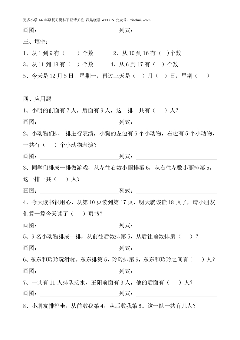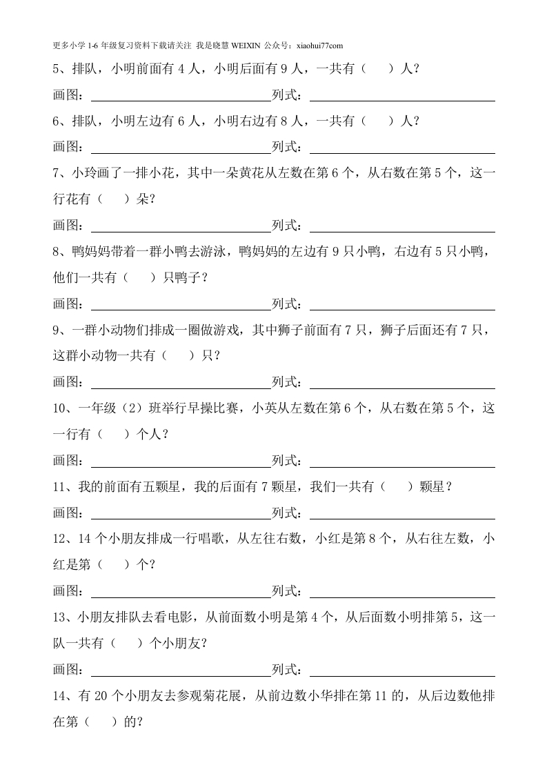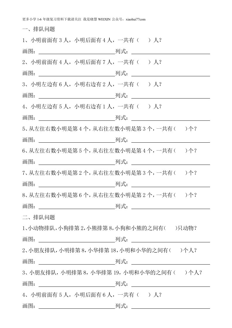更多小学16年级复习资料下载请关注我是晓慧VEIXIN公众号:xiaohui7?7com一、排队问题1、小明前面有3人,小明后面有4人,一共有()人?画图:列式:2、小明前面有4人,小明后面有7人,一共有()人?画图:列式:3、小明左边有6人,小明右边有2人,一共有()人?画图:列式:4、小明左边有5人,小明右边有1人,一共有()人?画图:列式:5、从左往右数小明是第4个,从右往左数小明是第3个,一共有()个?画图:列式:6、从左往右数小明是第5个,从右往左数小明是第4个,一共有()个?画图:列式:7、从左往右数小明是第2个,从右往左数小明是第3个,一共有()个?画图:列式:8、从左往右数小明是第6个,从右往左数小明是第2个,一共有()个?画图:列式:二、排队问题1、小动物排队,小狗排第2,小熊排第8,小狗和小熊的之间有()只动物?画图:列式:2、小朋友排队,小明排第8,小华排第18,小明和小华的之间有()个人?画图:列式:3、小朋友排队,小明排第8,小华排第19,小明和小华的之间有()个人?画图:列式:4、小明前面有5人,小明后面有6人,一共有()人?画图:列式: