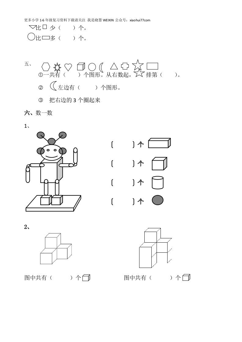 更多小学16年级复习资料下载请关注我是晓慧WEIXIN公众号:xiaohui77com一年级数学上册认识图形专项练习姓名:学号:用时一.数一数,填一填。○有()个,△有()个,☐有()个,有()个,0有()个,了有()个,有()个。二、数一数。影2(1)、正方体()个,长方体()个,圆柱()个,球()个。(2)、从右边起,第()和第()个都是正方体。三、小林要做公车去生活超市,这是公车的示意图.○有()个,g△有()个,口有()个,□有()个。○比△多()个,□再有()个和口同样多。四、数一数。口有()个Q口有()个V有()个有()个