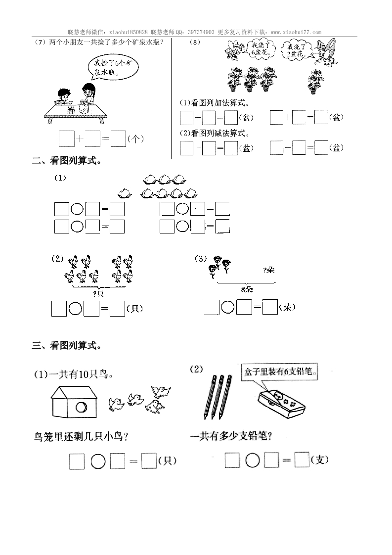 一年级数学上册8.9.10解决问题练习题xmtt884个月前发布关注私信6.83MB2页03713 第1页 / 共2页 第2页 / 共2页 已完成全部阅读,共2页 一年级数学上册8.9.10解决问题练习题此内容为付费资源,请付费后查看¥1¥2会员服务免费立即购买您当前未登录!建议登陆后购买,可保存购买订单付费资源© 版权声明文章版权归作者所有,未经允许请勿转载。THE END数学 文本预览 晓慧老师微信:xiaohuia850828晓慧老师Q:397374903更多复习资料下载:m.xiaohui'77.com解决问题基础习题班级姓名一、看图解决问题。.〔1--共石8位小朋友。(2)5个一共有几个管?还利几证小朋友?□○□=□个)☐○☐=☐位)(3(4)一共有9只。一共有几人?冰山里还藏若几只。二○□=☐人)○□=只)(5)一共有多少只小鸟?(6)一共有8只鸭子。上有4只小的游走3只☐+=) 查看更多 收起部分 喜欢就支持一下吧点赞13 分享QQ空间微博QQ好友海报分享复制链接收藏
