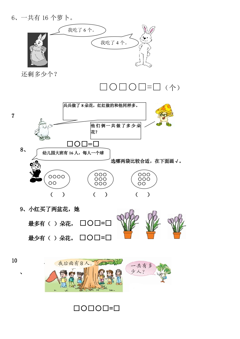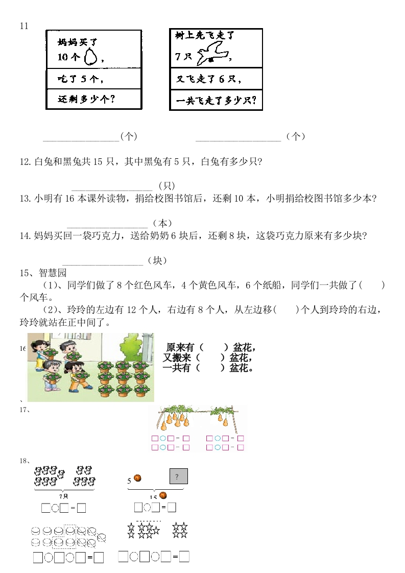 一年级数学上册期末应用题xmtt884个月前发布关注私信1.68MB32页0438 第1页 / 共32页 第2页 / 共32页 第3页 / 共32页 试读已结束,还剩29页,您可下载完整版后进行离线阅读 一年级数学上册期末应用题此内容为付费资源,请付费后查看¥1¥2会员服务免费立即购买您当前未登录!建议登陆后购买,可保存购买订单付费资源© 版权声明文章版权归作者所有,未经允许请勿转载。THE END数学 文本预览 四、解决实际问题。2画7个8个个9个☐○☐=☐器家子4.体育室原来有18个。界量分借走了10个。原来有()人在跳绳,又来了()人,一共有多少人?还刺多少个?5、第1盒和第3盒里的蜡笔是小明的,第2盒里的蜡笔是小林的。小明的蜡笔比小林多口小林的蜡笔比小明多口小明的蜡笔和小林同样多口16元9元元(1)比贵多少元?☐○□=□(元)(2)你还能提出什么问题?□O□=■(元) 查看更多 收起部分 喜欢就支持一下吧点赞8 分享QQ空间微博QQ好友海报分享复制链接收藏