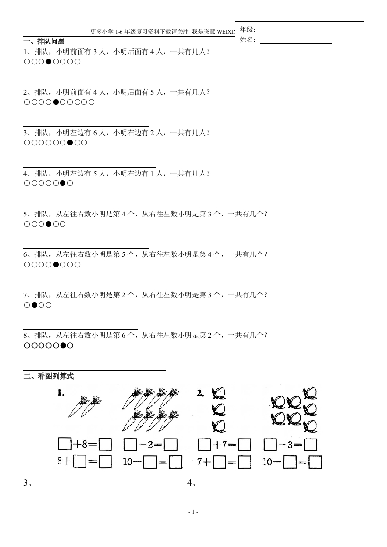 更多小学16年级复习资料下载请关注我是晓慧WEX年级:一、排队问题姓名:1、排队,小明前面有3人,小明后面有4人,一共有几人?0O0●OOO02、排队,小明前面有4人,小明后面有5人,一共有几人?0O00●0O0003、排队,小明左边有6人,小明右边有2人,一共有几人?0O00O0●O04、排队,小明左边有5人,小明右边有1人,一共有几人?OO00O●O5、排队,从左往右数小明是第4个,从右往左数小明是第3个,一共有几个?0O0●006、排队,从左往右数小明是第5个,从右往左数小明是第4个,一共有几个?OO00●0OO7、排队,从左往右数小明是第2个,从右往左数小明是第3个,一共有几个?O●OO8、排队,从左往右数小明是第6个,从右往左数小明是第2个,一共有几个?00000●0二、看图列算式1.2.Q220222妇□+8=□口-2=□☐+7=☐□-3=□8+☐=口10-□-☐7+☐-☐10-□=口3、4、-1-