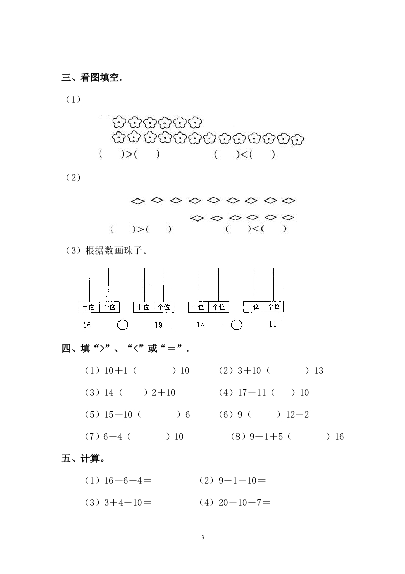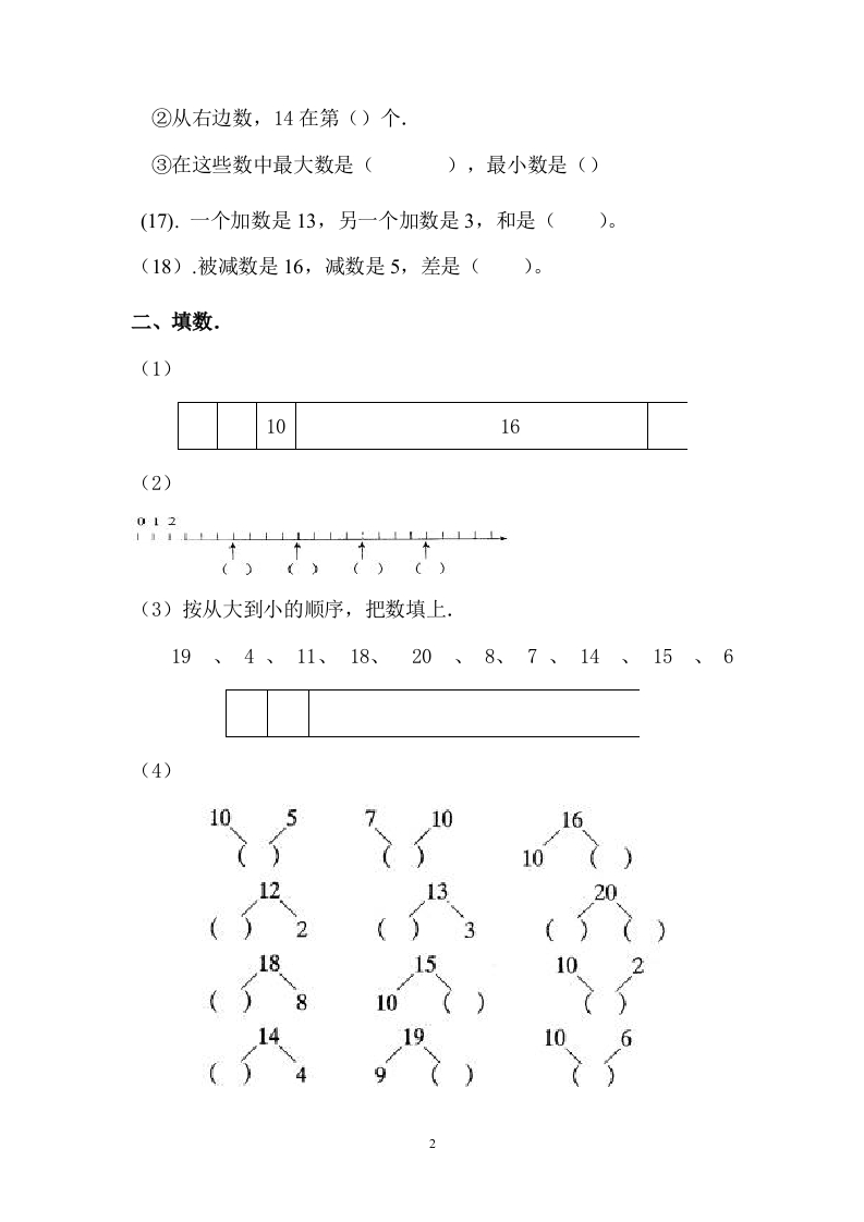 11-20各数的认识复习题一.填空(1)按顺序填数。()、()、12、()、()、15、()、()、()(2).15里面有()个十和()个一;4个一和1个十组成的数是()。(3).14前面一个数是(),与20相邻的两个数是()和()。(4).在16这个数中,个位上的数是(),表示()个():十位上的数是(),表示()个()。(5)从右边起,第一位是()位,第二位是()位。(6).16里面有()个十和()个(7).13是由()个十和()个一组成的(8).1个十和8个一组成的数是((9).2和10合起来是((10).17和19中间的数是((11).18里面去掉(),还剩10.(12).2个十是().(13).10加()得20.(14).和15相邻的数是()和((15).比20少1的数是().(16).在8,12,19,6,14,20这些数中①左边数起,19在第()个.