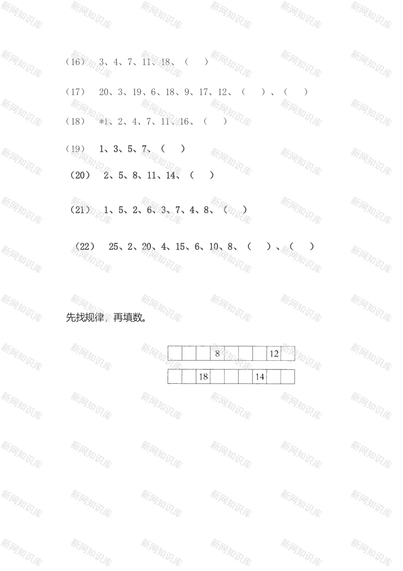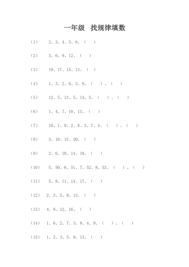 一年级找规律填数(1)2、3、4、5、6、()(2)3、6、9、12、()(3)19、17、15、13、()(4)1、3、2、6、3、9、()、()(5)12、5、13、5、14、5、()、()(6)1、4、7、10、13、()(7)10、1、9、2、8、3、7、4、()、()(8)5、10、15、20、()(9)2、6、10、14、18、()(10)5、50、6、51、7、52、8、53、()、()(11)5、8、11、14、17、()(12)2、3、5、8、13、()(13)4、8、12、16、()(14)1、6、2、7、3、8、4、9、()、()(15)1、2、3、5、8、13、()