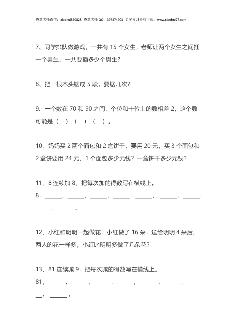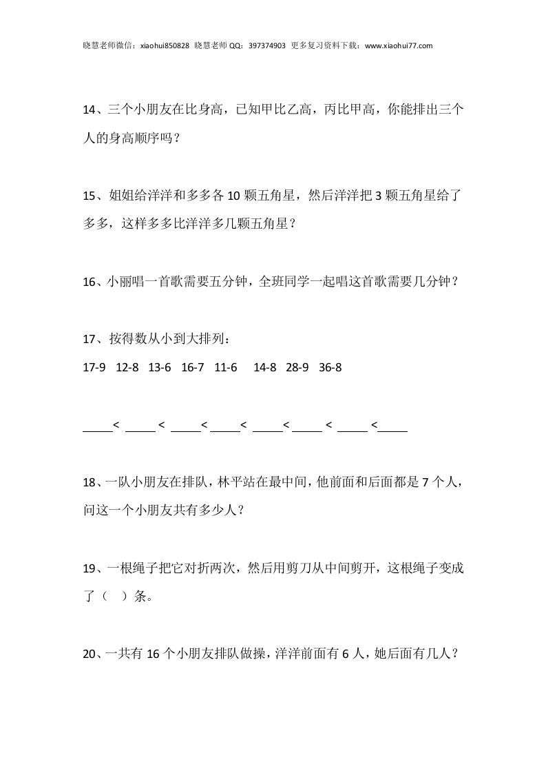 晓慧老师微信:xiaohui850828晓慧老师QQ:397374903更多复习资料下载:www.xiaohui7?7.com小学一年级数学62题思维训练1、小红家的挂钟,几时就敲几下,每半时也要敲一下,请问,从下午2时到5时,一共敲了几下?2、把3、4、5、6、7、8、9、10这八个数分别填入下面的()里(每个数只能用一次),使两个算式都成立。()+()-()=()()+()-()=()3、把2、5、6、8、9五个数分别组成两位数,最大的两位数是),最小的两位数是()。4、小明今年6岁,姐姐今年13岁,5年后姐姐比小明大几岁?5、小朋友放学排队,丁丁前面有7人,后面有6人,这一队有多少人?6、小冯这个组共有10个人,他和组内每一个人握一次手,得握几次?