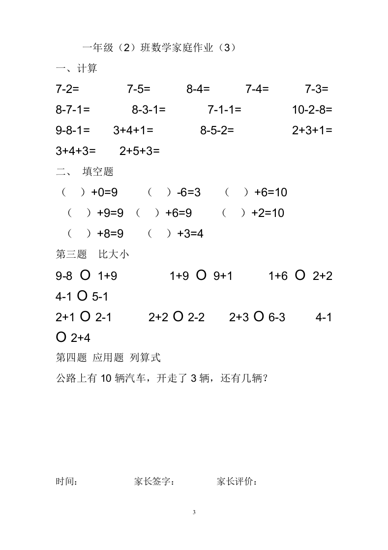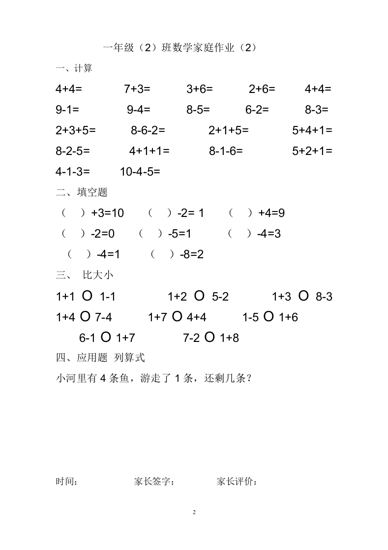 更多小学16年级复习资料下载请关注我是晓慧WEⅨN公众号:xiaohui77com一年级(2)班数学家庭作业(1)一、计算2+2=2+3=4+5=3+3=3+4=5+5=7+2=5+2=6+3=8+2=9-2-4=6-4-1=10-4-2=9-2-1=7-2-1=9-7-2=1+2+2=8-5-3=8-5-1=4-2-2=二、填空4+()=96+()=9()+7=74+()=61+()=56-()=3()+4=63+()=8三、比大小1+101-11+203-21+304-31+4○8-41+7○4+41+501+66-101+77-201+8四、应用题列算式草地上有3只小狗,又跑来5只小狗,现在有几只小狗?时间:家长签字:家长评价: