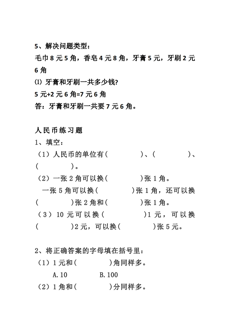 一年级数学上册人民币换算知识点及练习题人民币换算知识点1、人民币的单位有:元、角、分,相邻单位的进率是10,即1元=10角,1角=10分。2、人民币按制作材料分为纸币和硬币两种,按单位分为元币、角币和分币三种。其中元币共有七种,分别是1元、2元、5元、10元、20元、50元和100元;角币共有三种,分别是1角、2角和5角;分币也有三种,分别是1分、2分和5分。3、人民币的换算:(1)2元8角=(28)角2元10角=(30)角(2)2元8角=(2.80)元2元10角=(3)元(3)2.15元=(2)元(1)角(5)分12.00元=(12)元(4)0.70元=(7)角0.05元=(5)分4、换钱(1)换成一种:1张10元可以换(5)张2元(2)换两种以上:1张10元可以换(4)张2元和(2)张1元