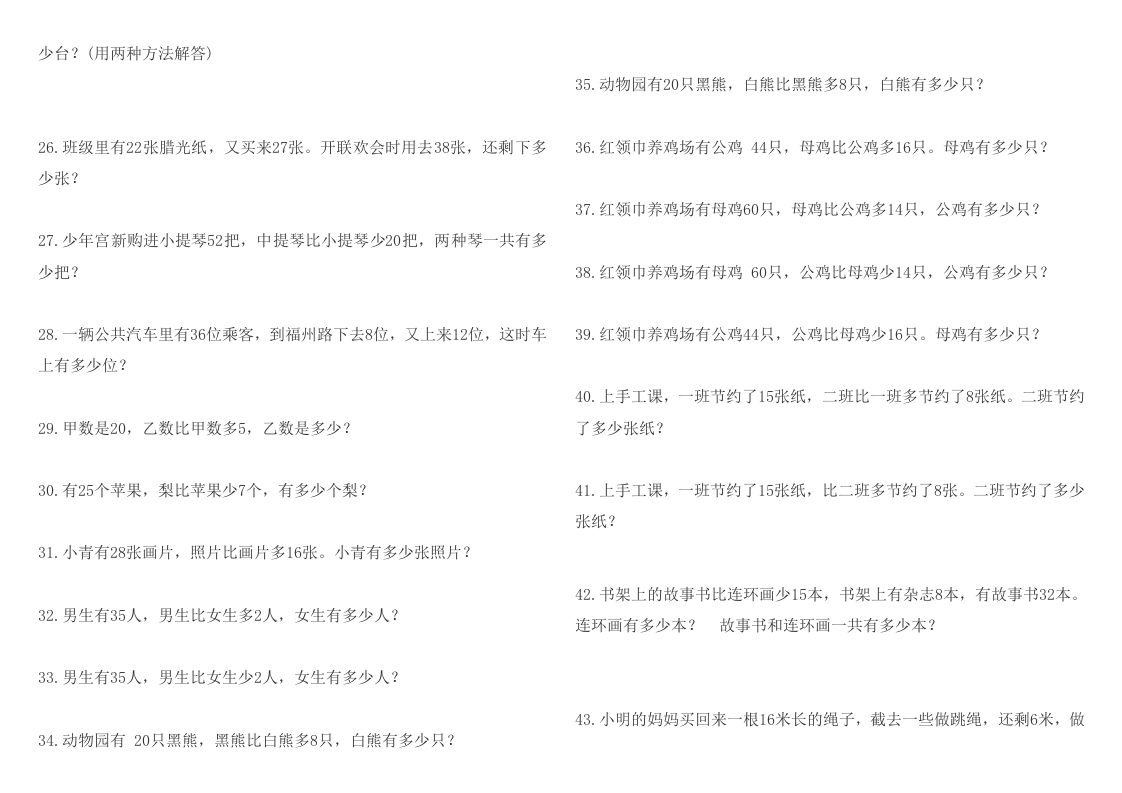上海小学一年级应用题练习180题1.教室里有30把椅子,来了42名同学,每人一把椅子,还有多少名小(1)小明从家到学校,再到少年宫,共走了多少米?朋友没有座位?2.北京:5-15℃,上海:10-18℃。(2)小明从家到学校比从家到少年宫少走多少米?(1)北京的温差是多少?8.小熊已经走了35米,离学校还有55米,小熊家到学校有多少米?(2)上海的温差是多少?9.小象出生时象妈妈29岁,小象今年16岁,象妈妈现在多少岁?3.捐书活动,一班捐27本,二班捐了30本书,三班捐了25本书。(1)二班比三班多捐多少本书?10.一卷电线长98米,先用去35米,又用去46米。(1)一共用去多少米?(2)二班和三班共捐多少本书?(2)张老师需要20米电线,剩下的够不够?请你再提出一个数学问题,并解答:问题:11.提出数学问题并解决:列式:大象:我比小鹿高14cm:4.笑笑折了42颗幸运星,比淘气少28颗,淘气折了多少颗?小鹿:我的身高是65cm:小兔:我比小鹿矮11cm:熊猫:我再长4cm就和小鹿一样高了。5.妈妈和爸爸去樱桃园摘樱桃,爸爸摘了68颗,妈妈再摘19颗就和他问题1:列式:同样多,妈妈摘了多少颗樱桃?问题2:列式:6.妈妈买皮球花了25元钱,还剩36元钱,妈妈有多少钱?12.小明做了15朵红花,10朵黄花,小兰至少要做多少朵才能超过他?学交735m42m54m明家