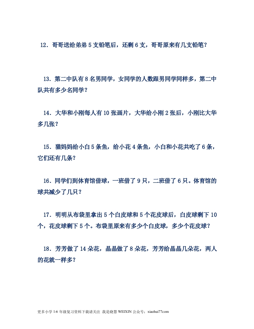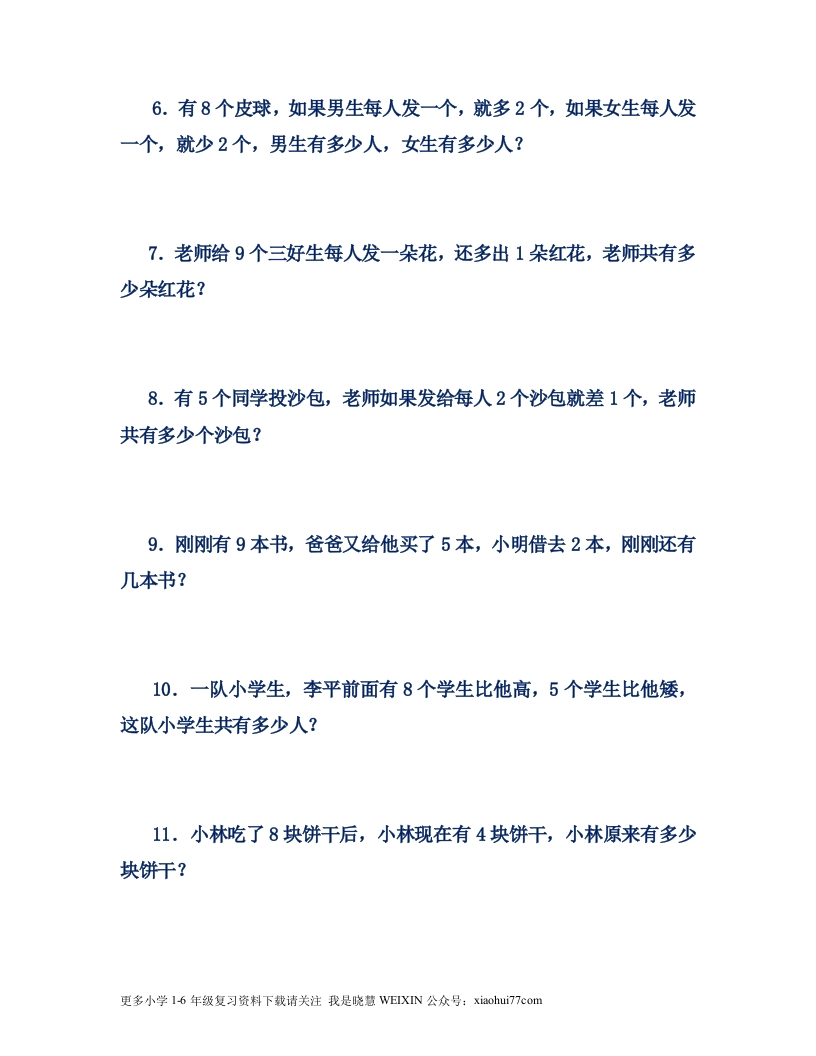 一年级数学思维应用50题(带答案)1.哥哥4个苹果,姐姐有3个苹果,弟弟有8个苹果,哥哥给弟弟1个后,弟弟吃了3个,这时谁的苹果多?2.小明今年6岁,小强今年4岁,2年后,小明比小强大几岁?3.同学们排队做操,小明前面有4个人,后面有4个人,这一队一共有多少人?4.有一本书,小华第一天看了2页,以后每一天都比前一天多看2页,第4天看了多少页?5.同学们排队做操,从前面数,小明排第4,从后面数,小明排第5,这一队一共有多少人?更多小学16年级复习资料下载请关注我是晓慧WEIXIN公众号:xiaohui77com
