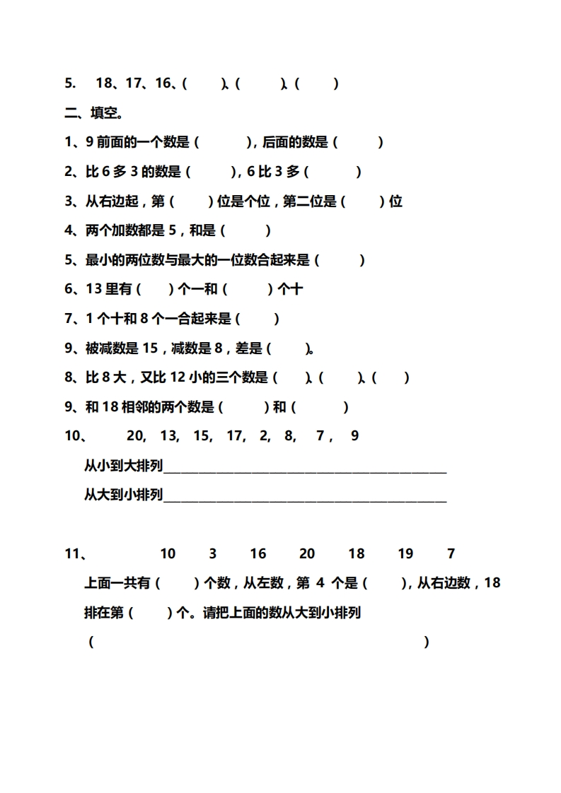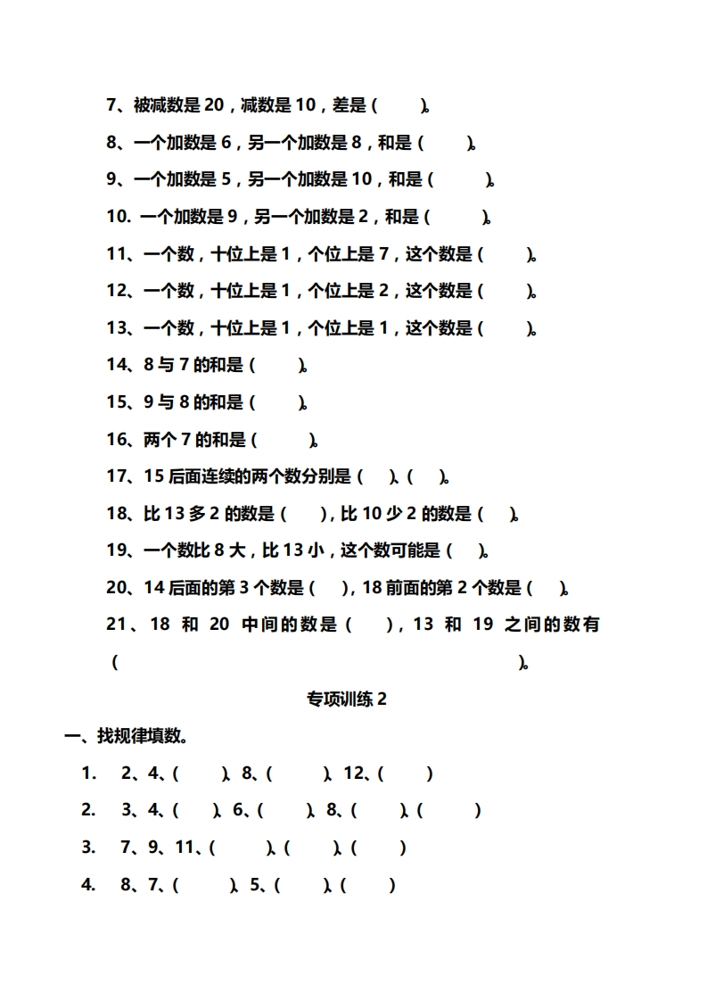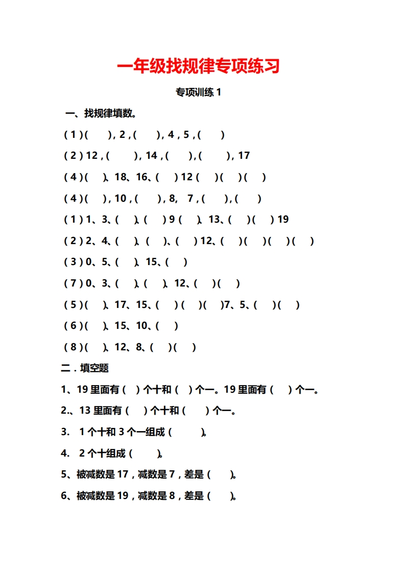 一年级找规律专项练习专项训练1一、找规律填数。(1)(),2,(),4,5,()(2)12,(),14,(),(),17(4)(λ18、16、()12()()()(4)(),10,(),8,7,(),()(1)1、3、(λ()9(λ13、()()19(2)2、4(λ().()12、()()()()(3)0、5、(λ15、()(7)0、3、(λ(λ12、()()(5)(λ17、15、()()()7、5、()()(6)()15、10、()(8)(入12、8、()()二.填空题1、19里面有()个十和()个一。19里面有()个一。2、13里面有()个十和()个一。3.1个十和3个一组成(。4.2个十组成(65、被减数是17,减数是7,差是(。6、被减数是19,减数是8,差是(。
