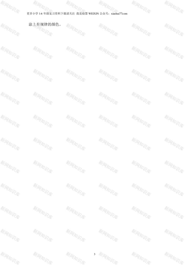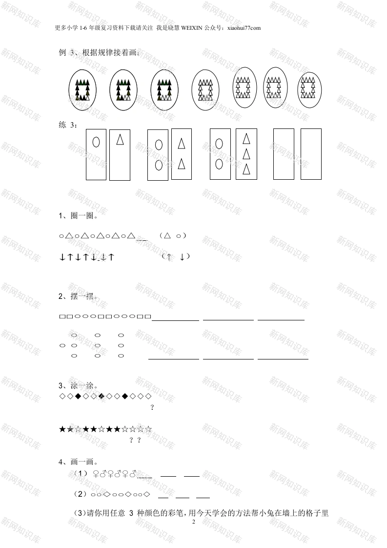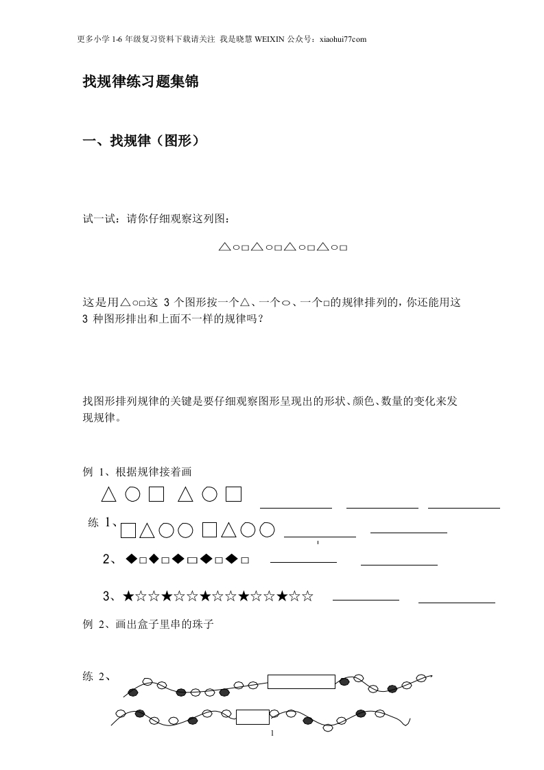 更多小学16年级复习资料下载请关注我是晓慧WEIXIN公众号:xiaohui77com找规律练习题集锦一、找规律(图形)试一试:请你仔细观察这列图:△0口△o口△0口△o口这是用△O口这3个图形按一个△、一个。、一个口的规律排列的,你还能用这3种图形排出和上面不一样的规律吗?找图形排列规律的关键是要仔细观察图形呈现出的形状、颜色、数量的变化来发现规律。例1、根据规律接着画△○□△○□练1☐△OO□△OO2、◆口◆口◆口◆口◆口3、★☆☆★☆☆★☆☆★☆☆★☆☆例2、画出盒子里串的珠子练2、