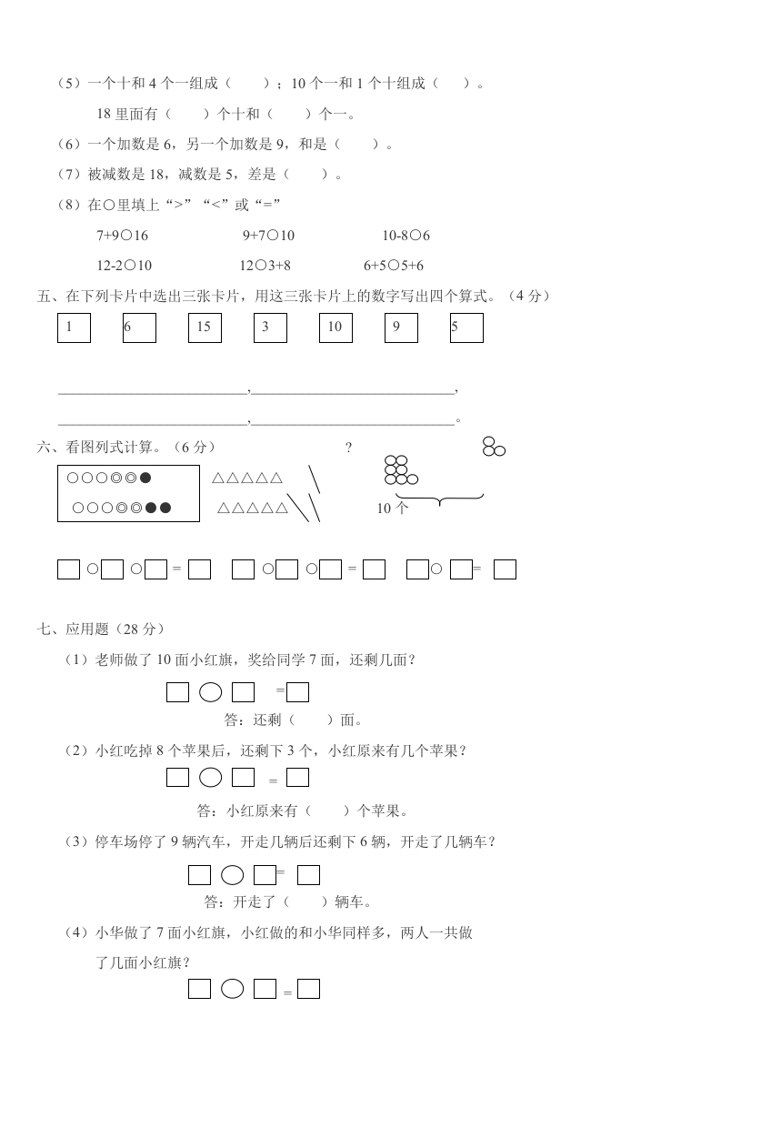 一年级数学试卷得分一、写数字和算式(7分,不规范不得分,扣完为止)(1)从1写到10(2)8+5=-13二、直接写出得数(15分)7+6=8+3=8-3=7+9=9+4=9-5=12-2=15-10=10-6=8+7=9+6=10+10=4+3+5=13-3-5=7-3+8=三、在()里填上合适的数(12分)7+()=1313-()=105=()-18+()=1710-()=48=()+610+()=12()+5=1410-4()=0()+()=134+9=()+()()+()=3+8四、填空(28分)1)上上上上上上上上山上上上上→9()()12()14()()()()19()(2)在8、11、18、12、15、20、16中,共有()个数,从左数第6个数是(),从右数,15排在第()个;其中比12大数有(),比18小的数有()。(3)将7、10、9、11、5按照从大到小的顺序排列是()。(4)12连续减2,12一、—、—、—、、—