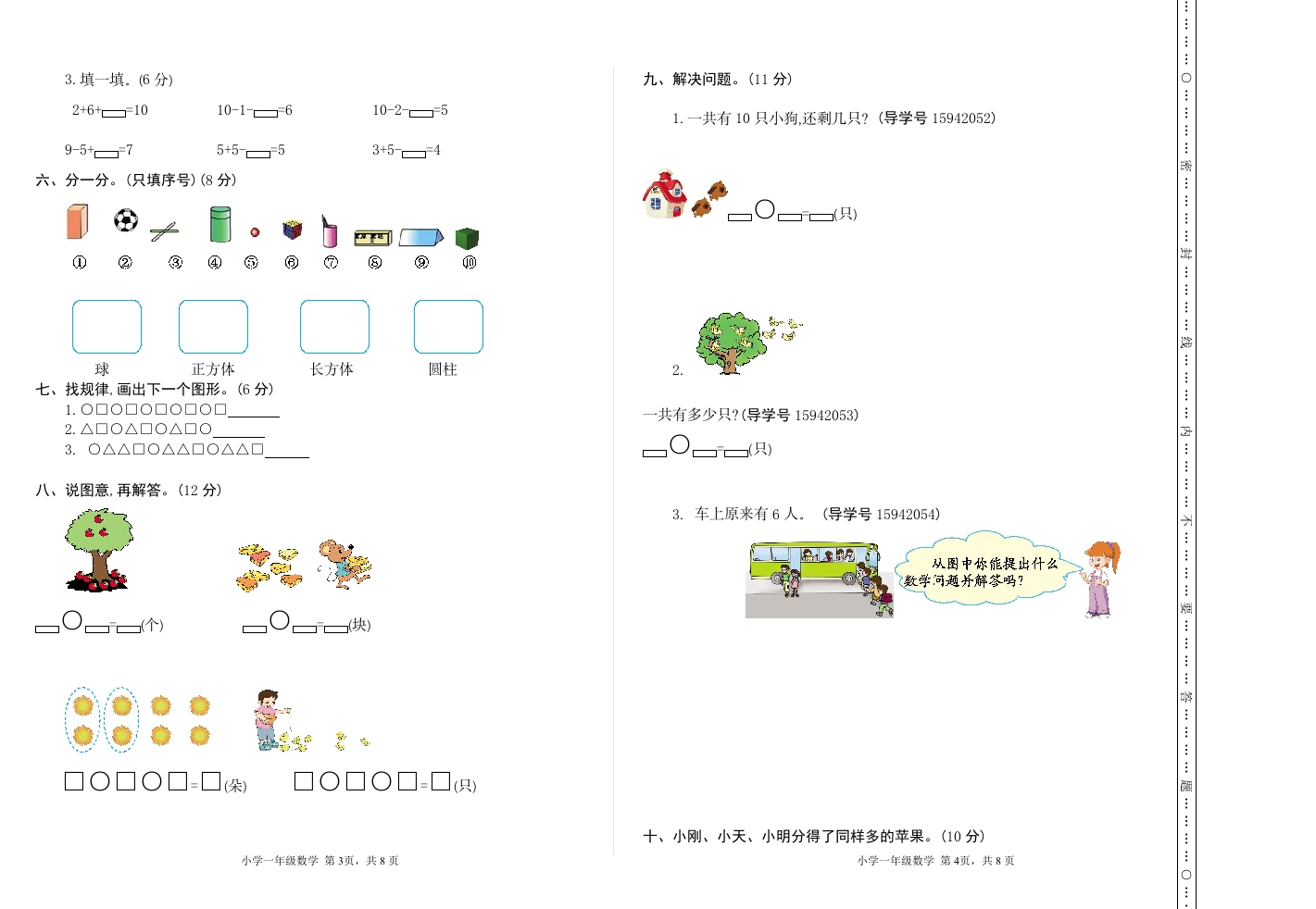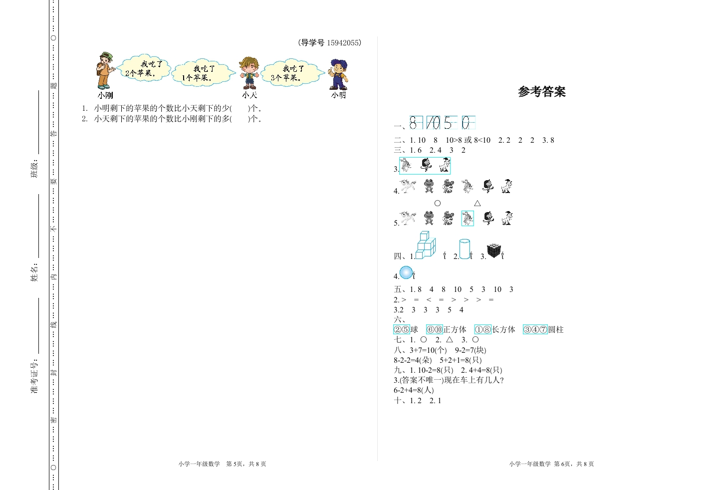 ::::一年级上学期期中检测卷(二)3.把右边的3只小动物圈在一起。e:4.在等左边的小动物下面画“O”,在游右边的小动物下面画“△”.班级:姓名:满分:100分:考试时间:90分钟5.圈出从左数第4只小动物.题序第一第二第三第四第五第六第七第八第九总分四、辨一辨。(8分)1.在多的后面画“.··:题题题题题题题题题如得分品白:2.在圆柱的后面画“”数一数,写一写。(8分)::管停学管限康得限暴0.:管管管管亲厚熹鼎083.在正方体的后面画“:二、比一比,填一填。(8分)天一战意吸吸意意惠点边急恋拿多华单要草草4.在易滚动的后面画“”。1.Q有个辱有()只.口O口:2.Q比票多(,要比Q少),再添上()只就和同样多了.·:五、算一算。(22分)3.猴子吃掉左边的2个,还剩个娘.1.看谁算得又对又快。(8分)0+8=4+0=三、圈一圈,画一画。(7分)10-2=1+9=:10-7+22+7-64+5+19-3-32.在○”里填上“>”“<”或“.8分)1.一共有()只小动物。5+4○83+7○108-4○510-2○8:2.从左数起,排第(),它的左边有()只小动物,右边有()只小动物。10-0○59+1○95+3○77+3○10小学一年级数学第1页,共8页小学一年级数学第2页,共8页: