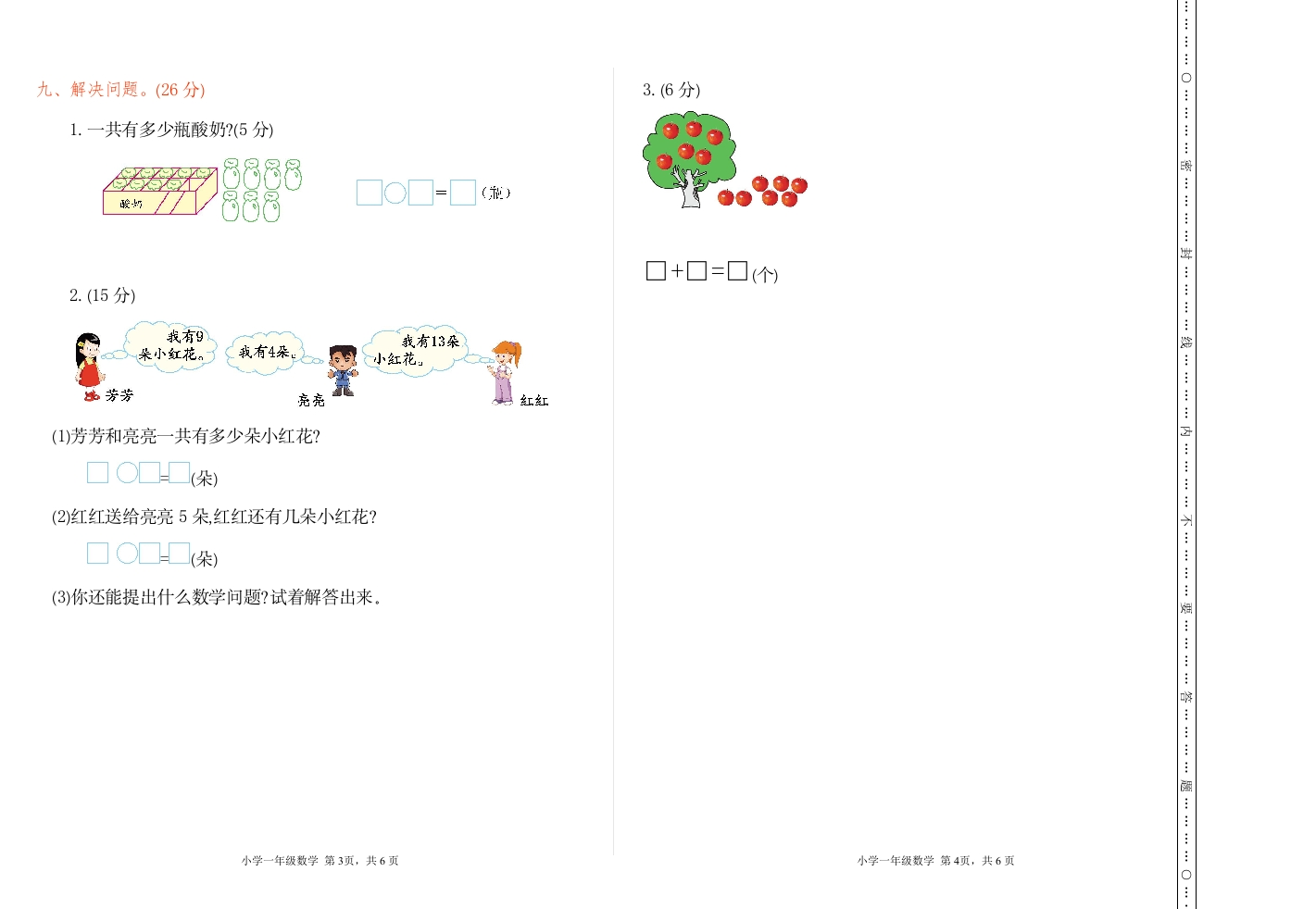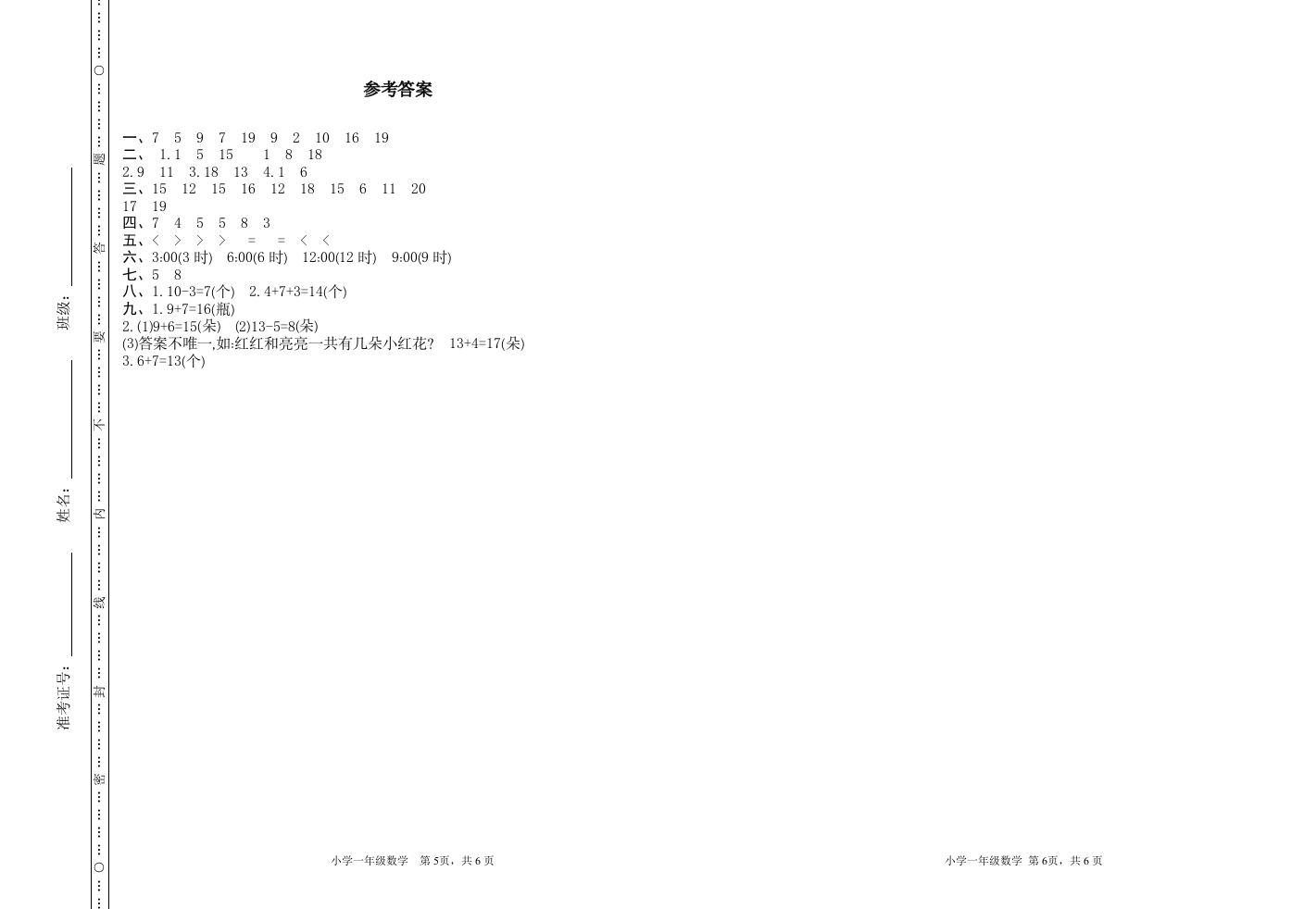 ::::一年级上学期期末检测卷(一)五、在O里填上“>”“<”或“=”。(8分)班级:姓名:满分:100分考试时间:90分钟18○2012+7○912○5+615-4○10题序第一第二第三第四第五第六第七第八第九总分6+3○10-15-5○10-107○5+396○6··:题题题题题题题题题六、写出下面钟面上的时间。(8分)tT7%如102得分-8七、数一数。(6分):一、夺红旗。(10分)·:0-3□名☐+1☐名☐+☐个1☐1☐8☐+6☐+☐二、填一填。(12分)八、看图列式计算。(6分)战巴巴©个十位个位10个1.十位个位1.有()个十和(口-口=口(个)个一,这个数是(有(个十和():个一,这个数是()·:2.与10相邻的两个数分别是()和(3.两个加数分别是3和15,和是().被减数是16,减数是3,差是()。4.16里面有()个十和(个帝帝的三、算一算。(12分)修产色修音的:18-3=16-4=8+7=7+5+4=19-7=10+8=6+9=15-5-4=2.?个2+9=15+5=14+3=17-4+6四、在括号内填上适当的数。(12分)口+口+口=□个)()-3=46+()F107-(=28+()1310-()=29+()=12O小学一年级数学第1页,共6页小学一年级数学第2页,共6页: