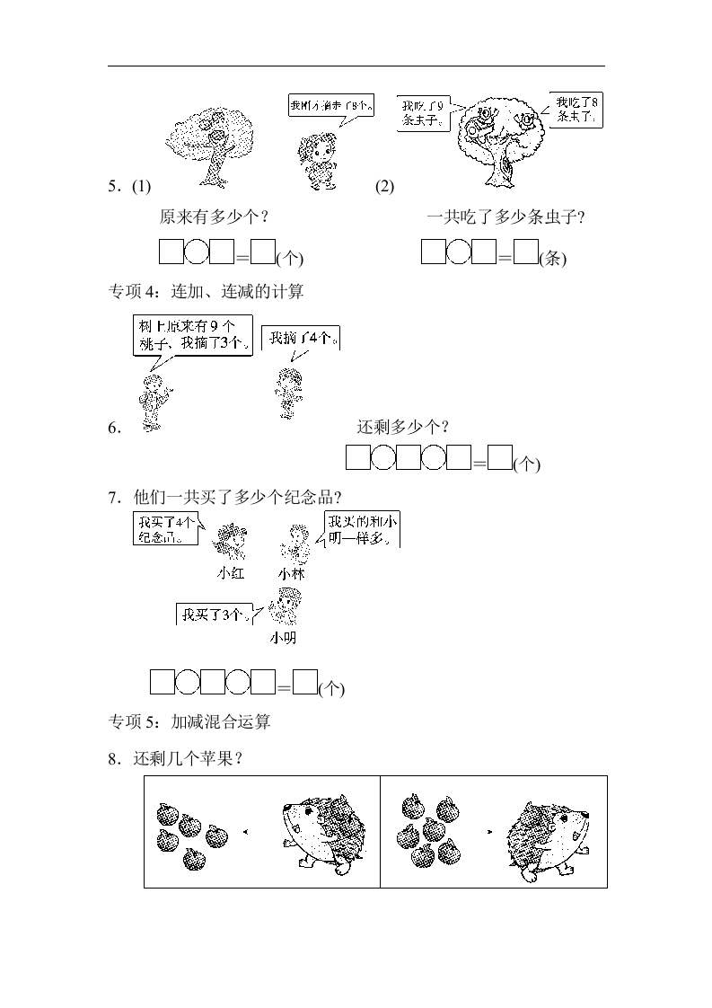 题型突破卷(5)xmtt884个月前发布关注私信87.55KB4页0406 第1页 / 共4页 第2页 / 共4页 第3页 / 共4页 试读已结束,还剩1页,您可下载完整版后进行离线阅读 题型突破卷(5)此内容为付费资源,请付费后查看¥1¥2会员服务免费立即购买您当前未登录!建议登陆后购买,可保存购买订单付费资源© 版权声明文章版权归作者所有,未经允许请勿转载。THE END数学 文本预览 题型突破卷5应用题专项1:10以内的加减法)和应共有多少个?(个)我头了1n个鬟我吃了6个。.F-2现在还剩几个鑫?□-□-☐个专项2:20以内的不进位加法和不退位减法我行了11颗我得了6颗。3它们一共得了多少颗?颗)树上原来有17个节果我揂2个。4树上还剩下多少个苹果?专项3:20以内的进位加法 查看更多 收起部分 喜欢就支持一下吧点赞6 分享QQ空间微博QQ好友海报分享复制链接收藏