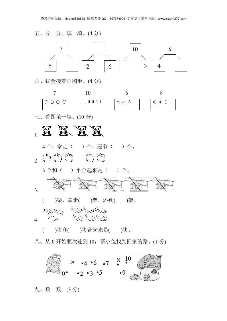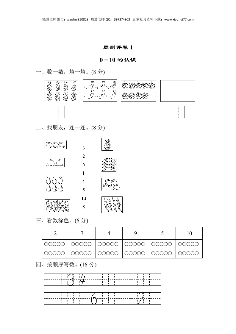 晓慧老师微信:xiaohui850828晓慧老师QQ:397374903更多复习资料下载:www.xiaohui77.com周测评卷10-10的认识一、数一数,填一填。(8分)静舞}管二、找朋友,连一连。(8分)32、、★64新的心》35108三、看数涂色。(6分)2749510O0000o0000o0000O0O00o0000O0000ooooooooooooooO00O0O00O0ooooo四、按顺序写数。(16分)6日