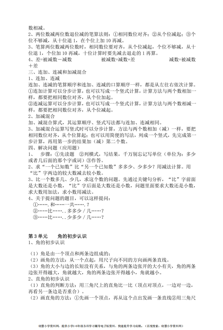 备战期末二年级数学上册期末复习要点(人教版)第1单元长度单位1、常用的长度单位:米、厘米。2、测量较短物体通常用厘米作单位,测量较长物体通常用米作单位。3、测量物体长度的方法:将物体的左端对准直尺的“0”刻度,看物体的右端对着直尺上的刻度是几,这个物体的长度就是几厘米。4、米和厘米的关系:1米=100厘米100厘米=1米5、线段(1)线段的特点:①线段是直的:②线段有两个端点:③线段有长有短,是可以量出长度的。(2)画线段的方法:先用笔对准尺子的’0”刻度,在它的上面点一个点,再对准要画到的长度的厘米刻度,在它的上面也点一个点,然后把这两个点连起来,写出线段的长度。(3)测量物体的长度时,当不是从“0”刻度量起时,要用终点的刻度数减去起点的刻度数。6、填上合适的长度单位。小明身高1(米)30(厘米)练习本宽13(厘米)铅笔长17(厘米)黑板长2(米)一张床长2(米)一口井深3(米)学校进行100(米)赛跑图钉长1(厘米)教学楼高25(米)宝宝身高80(厘米)跳绳长2(米)棵树高3(米)一把钥匙长5(厘米)一个文具盒长24(厘米)讲台高90(厘米)门高2(米)筷子长20(厘米)教室长12(米)棵小树苗高1(米)小朋友的头围48厘米爸爸的身高1米75厘米或175厘米小朋友的身高120厘米或1米20厘米第2单元100以内的加法和减法一、两位数加两位数1、两位数加两位数不进位加法的计算法则:把相同数位对齐列竖式,在把相同数位上的数相加。2、两位数加两位数进位加法的计算法则:①相同数位对齐:②从个位加起:③个位满十向十位进1。3、笔算两位数加两位数时,相同数位要对齐,从个位加起,个位满十要向十位进“1”,十位上的数相加时,不要遗漏进上来的“1”。4、和=加数+加数一个加数=和一另一个加数二、两位数减两位数1、两位数减两位数不退位减的笔算:相同数位对齐列竖式,再把相同数位上的晓慧小学资料网,提供小学1-6年级各科学习辅导电子版资料,快速提升学习成绩。(百度搜索:晓慧小学资料网)