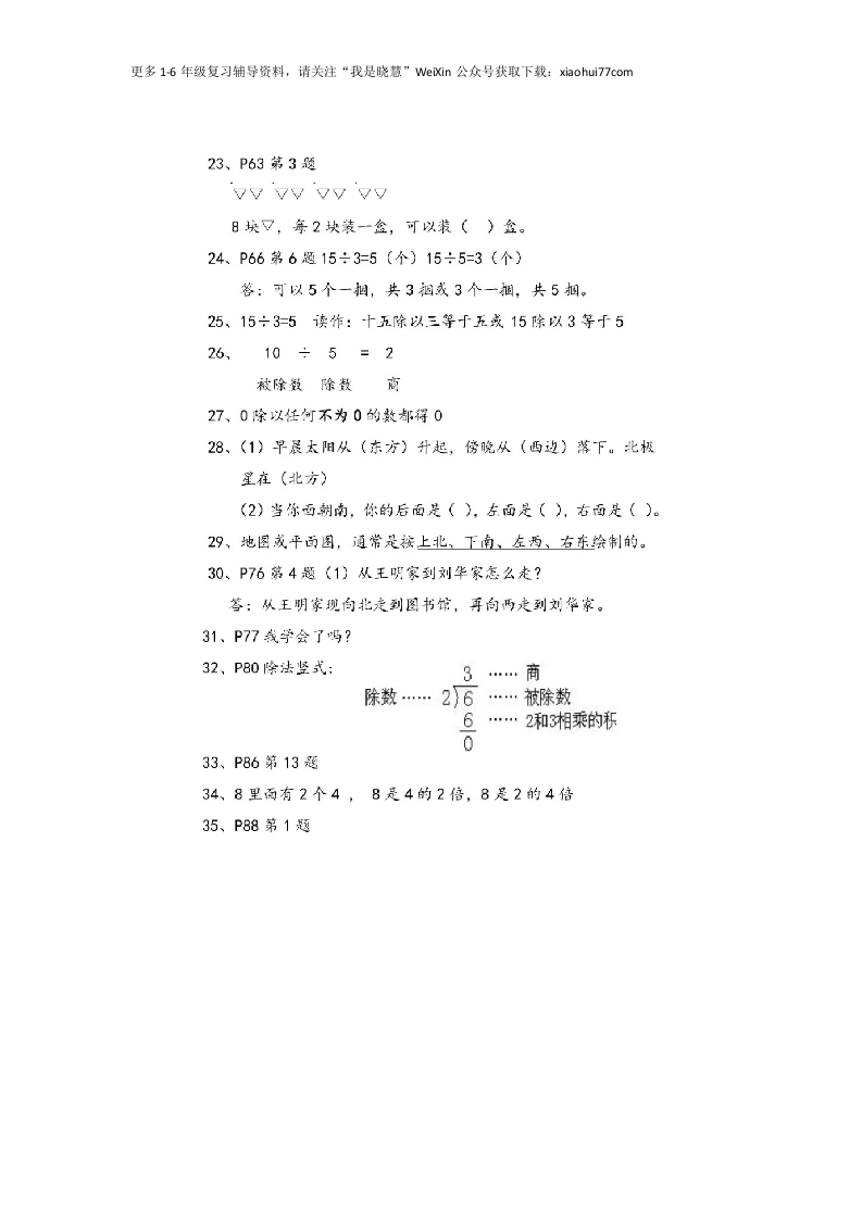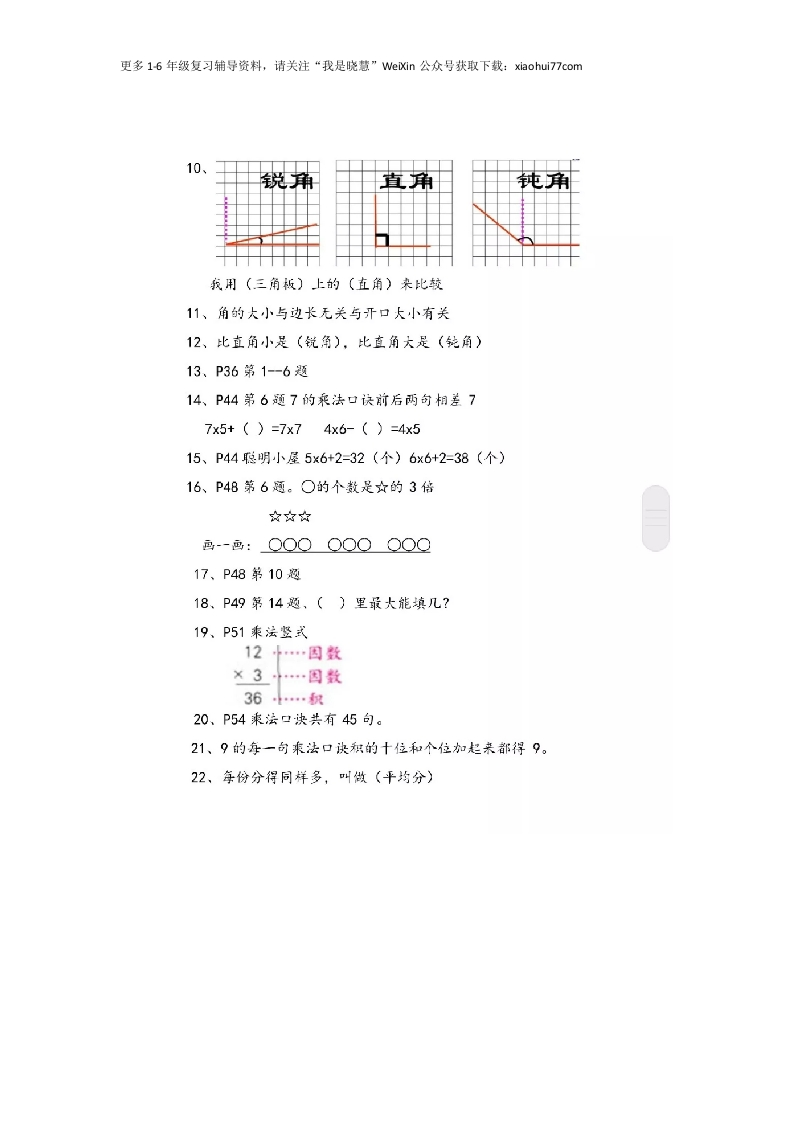 更多16年级复习辅导资料,请关注“我是晓慧”Wein公众号获取下载:xiaohui77com二年级数学上册知识点汇总丨青岛版,暑期预习青岛版数学二年级上册知识点二年级数学复习(知识点、滩点总给)1、P65×8=40读作:五乘八等于四十或5乘8等于40因数因数积2、2x4表示:(①4个2相加:2+2+2+2画-画:O OO OO○Q22个4扫办加:4+4画--色:Q○Q○○○○○3、相同加数相加(加数相同),可以用乘法表示4、P14第5题每盘有(5)块,有(3)盘,--共有(15)块。加法算式:5+5+5乘法算式:3x5=15口诀:三五十五5、P17第4题-共有多少根筷子?求〔4)个(2)相加的和是多少。加法荠式:2+2+2+2=8乘法算式:2x4=8口诀:二四得八6、我发现精着看2的乘法口决有2句,三的乘法口诀有三向,四的乘法心诀有四句…7、P23第3题O○○O C0OO O○OO O0OO O4×4+1=17或4x5-3=178、P26第13题(15)块(15)块(11)块9、边顶点《角有(一)个顶点(两)条边。边