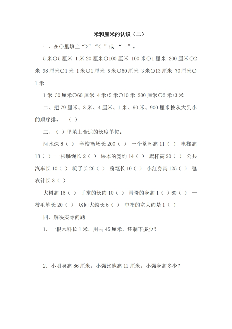 米和厘米的认识(一)一、在O里填上>、<或=。3米○30厘米60厘米▣100厘米2米○20厘米1米0100厘米4厘米01米50米○5米二、在()里填上合适的长度单位。(1)一枝蜡笔长10()(2)姐姐身高是1()46():(3)一条裤子长1()(4)一把剪刀长13()(5)一幢大楼高56()(6)一根丝瓜长60()(7)教室门高2()(8)写字台高80()(9)一条成人围巾长2()(10)习字本长32()三、将下面的长度按从小到大的顺序排一排。40厘米1米1厘米10厘米四、量一量,填一填。你坐的方凳长()厘米,宽()厘米,高()厘米。五、解决问题。1、一捆绳子长15米,第一次用去5米,第二次用去6米,一共用去多少米?还剩下多少米?2、一枝蜡笔用去2厘米,还剩下8厘米,这枝蜡笔原来长多少厘米?