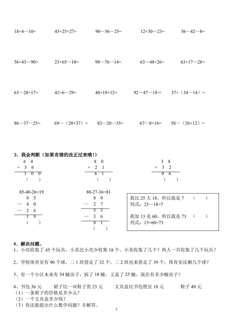 二年级2013一2014上册数学复习提纲(100以内加减法)伤年班号姓名订正情况:()卿朋友们,还记得上100以内加减法时的课吗?课上你们那高高举起的小手至今令老师难忘,你们的表现是那么的棒,很快就算出来了。现在我们一起来回忆一下。这部分知识在课本P11一37。相信你们是最棒的!一、知识整理:1.我知道了用竖式计算时()要对齐,先从()位算起:当个位相加满十时要向()进一;当个位不够减时,向()位退一:笔算连加连减和加减混合时,要从()到(),有括号的要先算括号里的。2.当个位相加得10,要在个位写()。当然这单元的知识还有很多哦!你可以和爸爸妈妈再说一说!二、相关练习:1.口算、65+37=61+29=63+26=83+17=57+10-3+50=7+12=69+19=49+20=20+13=9+85=27+24=23+13=37+58=6+76=34+41=45+37=35+62=37+31=19+30=30+38=37+17=39+5285+7=94-32=83-32=26-10=54-15=19-3=75-58=54-48=80-48=83-47=60-47=85-48=67-3=67-4=55-8=17-10-61—7=9859=61-34=33-5=40—26=98-11=61-6=77-35=60-12=96-37=77-21=56-5=92-76=53-53=41-21=80—67=54-22=19-8=58-54=69-10=56-23=90-3=86-43=72-19=80-41=2.竖式计算37+46-54=81-32-27=42-34+57=37+(34一30)=28+35+23=76+18-55=72—(44-14)=19+32+39=46+29-37=44-32+68=78-24+39=64+20一6=27+46-54=61-12-27=52-34+47=44-27+16=60-49+28=15—6+36=73一40+20=20+6-7=
