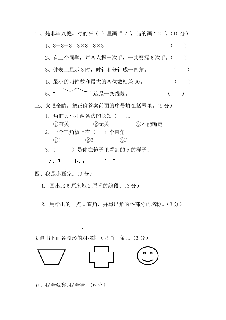 小学二年级数学上册竞赛试题姓名:班级:分数:一、知识根据地。(28分)1.3米-100厘米=()米6米+49米=()米2.你喜欢的乘法口决是(),你能根据这个口诀写出两个不同算式吗?()3.☒网@a(1)上面一共有()烟。(2)根据图写成加法算式是(),写成乘法算式是()。4.一个因数是8,另一个因数是7,列成算式是(读作()。5.小丽在图画本上画了☆☆☆和一些O和△,其中O的个数是☆的5倍,O有()个,△的个数是☆的9倍,△有()个。6.在○里填上“十、一、×、>、<或=”。4○9=363×4○4×516+20○3540○4=362×2○2+22×8+8○8×3-87.()里最大能填几?()×8<65)<5X930>5×()8.填上合适的单位名称。一支彩笔长10()妈妈身高1()62()9.数一数,试一试。(2分)右图中有()条线段,一共有()个角,其中有()个直角。10.小明昨天写了29个大字,今天写了47个大字,两天大约写了()个大字。