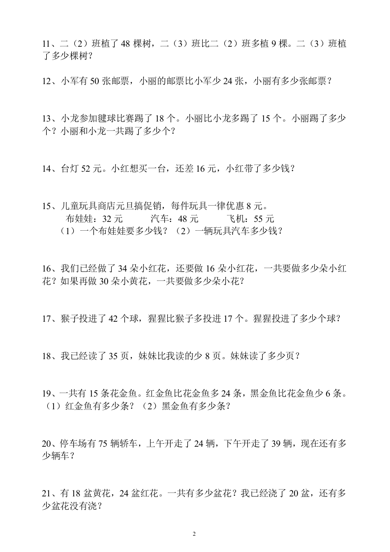 二年级上册数学解决问题专项练习1、大乌龟下了86个蛋,小乌龟比大乌龟少下了9个蛋,小乌龟下了多少个蛋?2、人工野鸭岛今年有53只野鸭,去年比今年少18只。去年有多少只?3、植物百科全书要32元,小玉想买一本,但还差15元。小玉现在有多少钱?4、共有84个大南瓜,李大爷运走了40个,王叔叔运走了26个。还剩多少个?5、车上原来有67人,下来了25人,又上去了28人,现在有多少人?6、美术小组有14名女生,男生比女生少5人。男生有多少人?美术小组一共有多少人?7、二(1)班有36幅画,二(2)班有27幅画。两个班一共有多少幅画?已经贴好了41幅,还剩多少幅没贴好?8、运走了18箱橘子,还剩下29箱橘子。一共收了多少箱橘子?还收了43箱柚子,橘子和柚子一共收了多少箱?9、一捆电线长100米,一班先用去20米,又用去38米。一共用去了多少米?二班需要40米,剩下的电线够不够?10、小明今年13岁,爸爸比小明大28岁,爸爸今年多少岁?妈妈比爸爸小3岁,妈妈今年多少岁?1