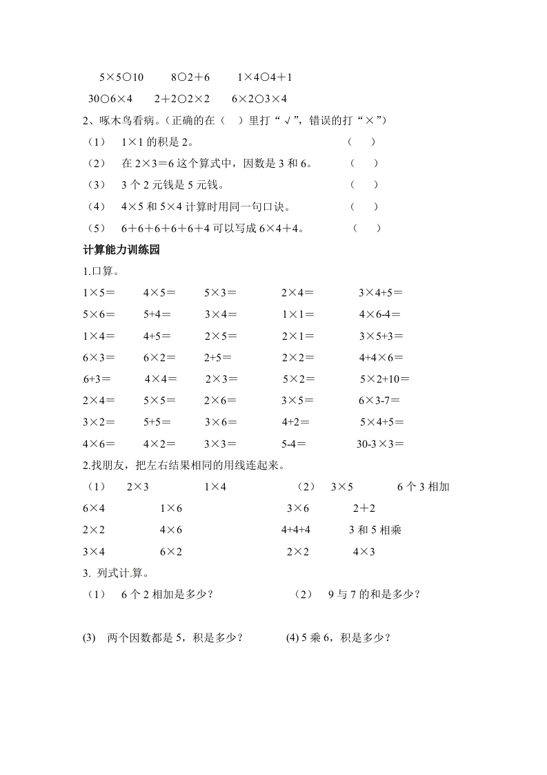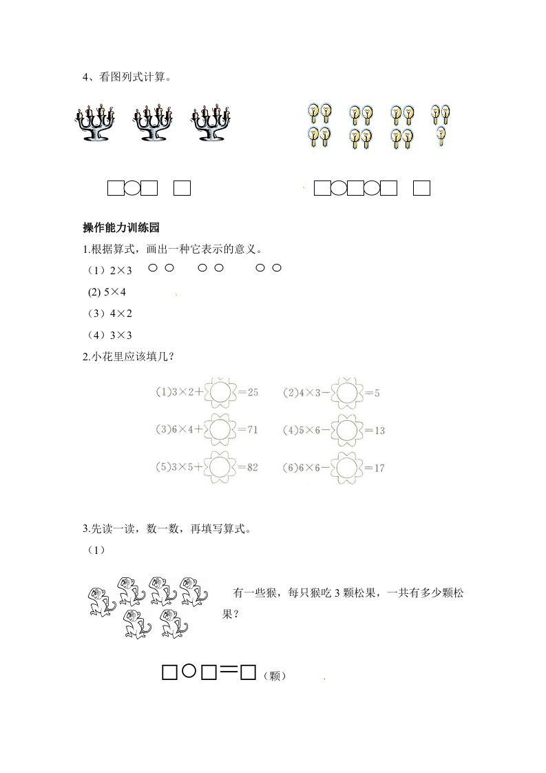 第四单元测试卷基本能力训练园1.填空(1)一共有个桃子。写成加法算式是写成乘法算式是。表示的意义是(2)PP®一共有个蘑菇。写成乘法算式是,他表示的意义是,还可以表示(3)根据“五六三十”这个口诀写出两个乘法算式是:和(4)一个因数是5,另一个因数是3,积是()。(5)写出四道得数是12的乘法算式。()×()=12()×()=12()×()=12()×()=12(6)从3、6、5、18这四个数中选出三个数,写出两道乘法算式:()×(.)=()()×()=()(7)6+6+6+6+3改写成乘加算式是5+5+5一2改写成乘减算式是(8)5×()<164×4=4×3+()18>6×()5×3=5×4-()(9)在O里填上“十”、“一”或“X”。405=20204=6802=63○6=183O3=9506=30601=63005=25(10)在O里填上“>”、“<”、“=”