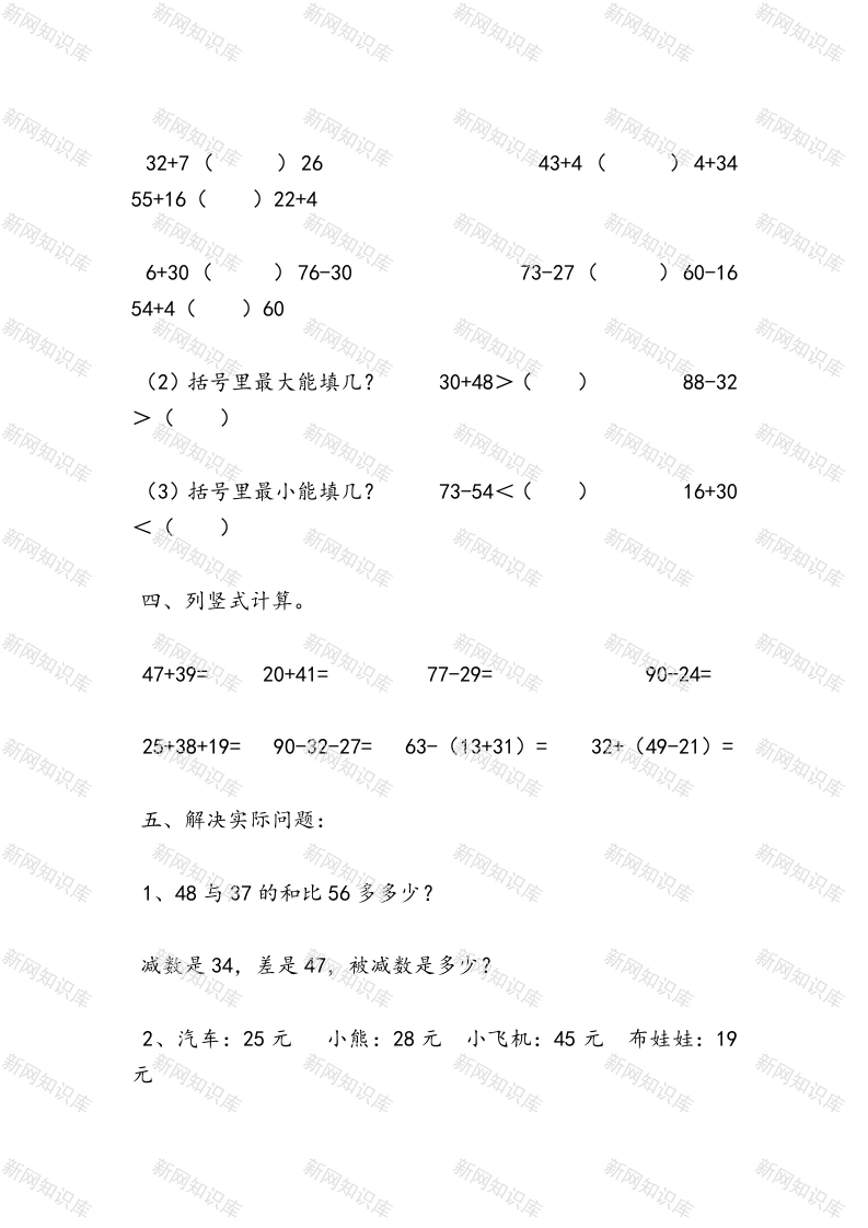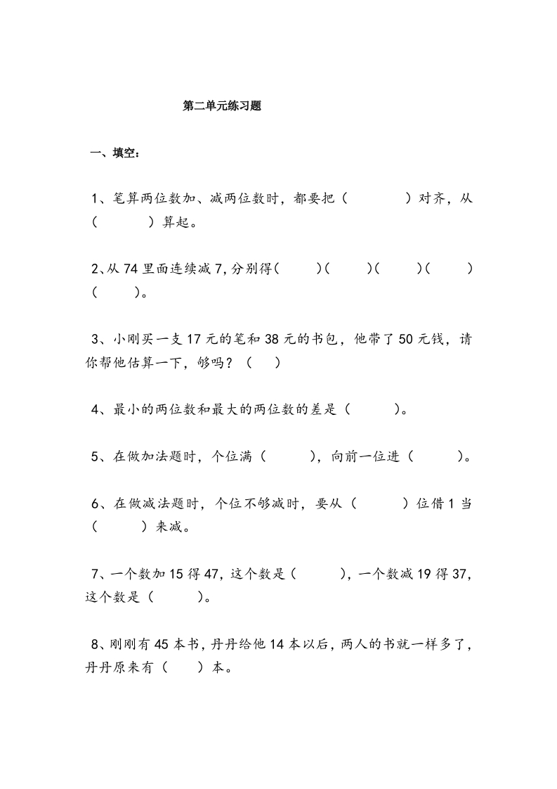 第二单元练习题一、填空:1、笔算两位数加、减两位数时,都要把()对齐,从)算起。2、从74里面连续减7,分别得()()()()()。3、小刚买一支17元的笔和38元的书包,他带了50元钱,请你帮他估算一下,够吗?()4、最小的两位数和最大的两位数的差是()。5、在做加法题时,个位满(),向前一位进()。6、在做减法题时,个位不够减时,要从()位借1当()来减。7、一个数加15得47,这个数是(),一个数减19得37,这个数是()。8、刚刚有45本书,丹丹给他14本以后,两人的书就一样多了,丹丹原来有()本。