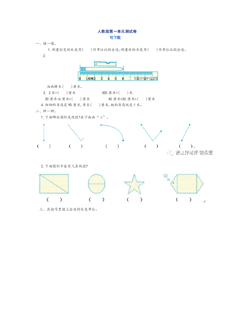 人教版第一单元测试卷可下载一、填一填1.测量铅笔的长度用()作单位比较合适;测量床的长度用()作单位比较合适。2.01厘米2356辄弯好师京理是油画棒长()厘米。3.2米=()厘米300厘米=()米30厘米-6厘米=()厘米45厘米+20厘米=()厘米4.甜甜的身高是90厘米,再长()厘米,地的身高就是1米。二、辨一辨。1.下面哪些图形是线段?在下面画“√”。:镇L好诺师微课堂2.下面图形中各有几条线段?☆()()三、在括号里填上合适的长度单位。
