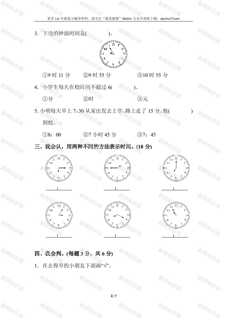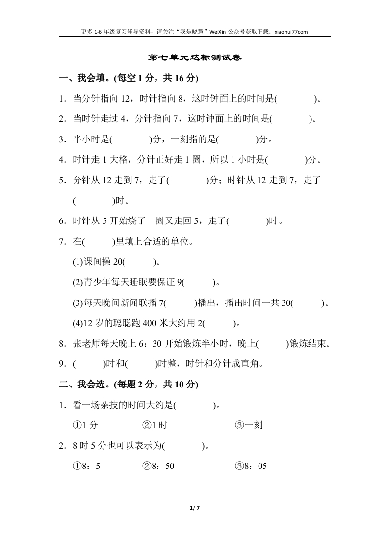 更多16年级复习辅导资料,请关注“我是晓慧”WeiXin公众号获取下载:xiaohui77com第七单元达标测试卷一、我会填。(每空1分,共16分)1.当分针指向12,时针指向8,这时钟面上的时间是()2.当时针走过4,分针指向7,这时钟面上的时间是()3.半小时是()分,一刻指的是()分。4.时针走1大格,分针正好走1圈,所以1小时是()分。5.分针从12走到7,走了()分:时针从12走到7,走了()时。6.时针从5开始绕了一圈又走回5,走了()时。7.在()里填上合适的单位。(1)课间操20()(2)青少年每天睡眠要保证9()。(3)每天晚间新闻联播7()播出,播出时间一共30((4)12岁的聪聪跑400米大约用2()8.张老师每天晚上6:30开始锻炼半小时,晚上()锻炼结束。9.()时和()时整,时针和分针成直角。二、我会选。(每题2分,共10分)1.看一场杂技的时间大约是()①1分②1时③一刻2.8时5分也可以表示为(①8:5②8:50③8:051y7
