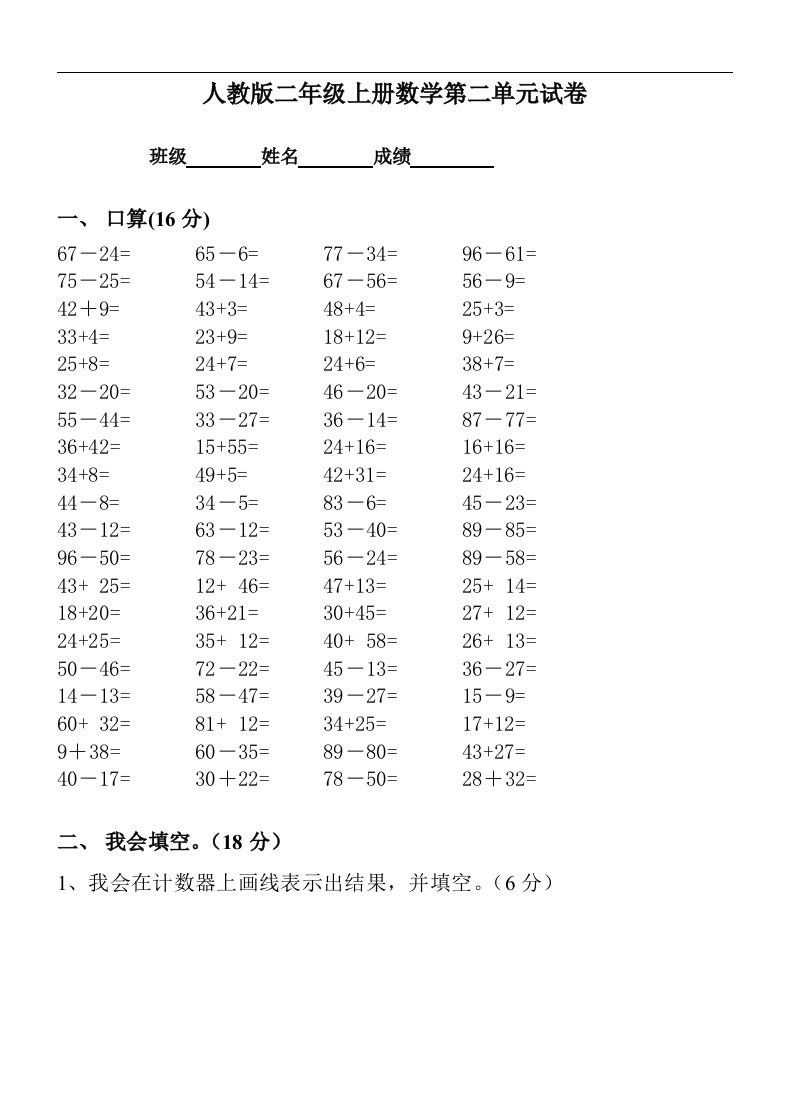 人教版二年级上册数学第二单元试卷班级姓名成绩一、口算(16分)67-2465一6=77-34=96-61=75-25=54-14=67-56=56-9=42+9=43+3=48+4=25+3=33+4=23+9=18+12=9+26=25+8=24+7=24+6=38+7=32-20=53-20=46-20=43-21=55-44=33-27=36-14=87-77=36+42=15+55=24+16=16+16=34+8=49+5=42+31=24+16=44-8=34-5=83-6=45-23=43-12=63-12=53一40=89-85=96-50=78-23=56-24=89-58=43+25=12+46=47+13=25+14=18+20=36+21=30+45=27+12=24+25=35+12=40+58=26+13=50-46=72-22=45-13=36-27=14-13=58-47=39-27=15-9=60+32=81+12=34+25=17+12=9+38=60一35=89-80=43+27=40-17=30+22=78-50=28+32=二、我会填空。(18分)1、我会在计数器上画线表示出结果,并填空。(6分)