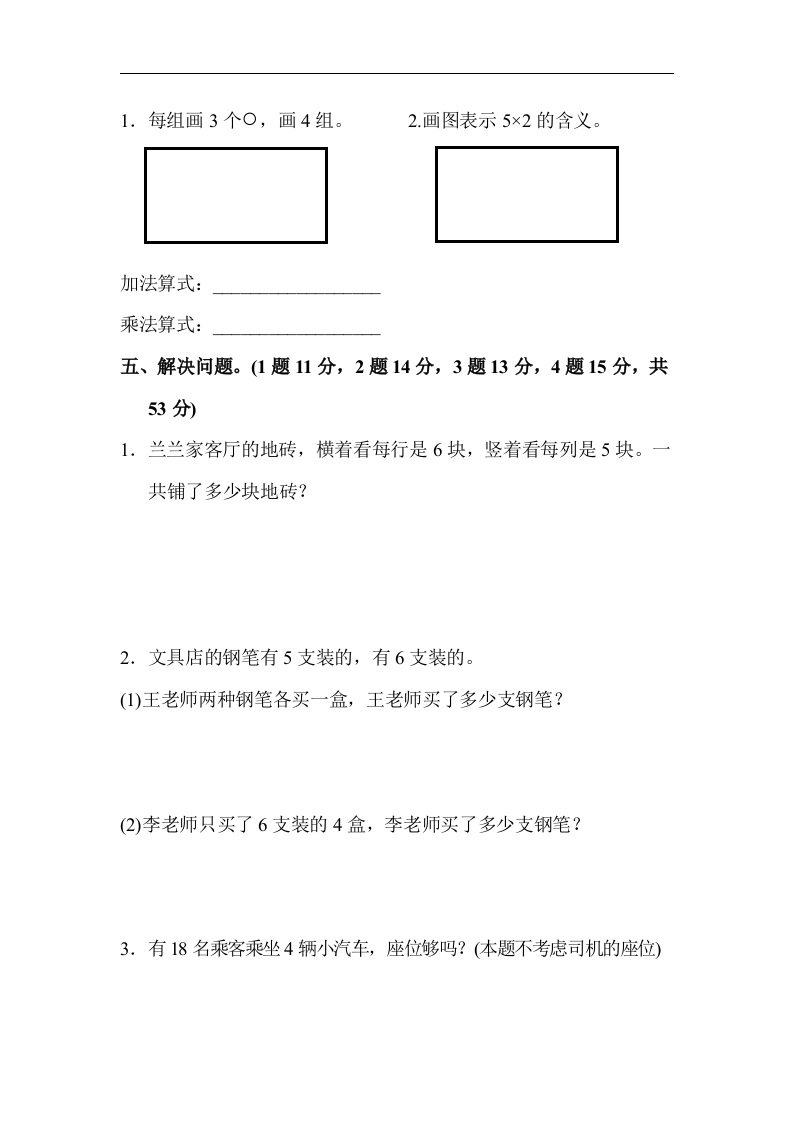教村过关卷(⑤)一、我会填。(每题4分,共12分)1.)个〔加法算式:)x()十()=(乘法算式:)x()-()=(3.把下面的加法算式改写成乘法算式,乘法算式改写成加法算式。(1)4+4+4=()((2)0+0+0+0+0=((3)7×3=()+()十()(4)4×5=()+()+()十()二、我会判。(每题3分,共15分)1.2个3相加的和与3个2相加的和相等。2.5×3=15,读作5乘3等于15。3.两个乘数都是6,积是多少?列式为:2×6=12。4.计算3×5和5×3用同一句口诀。5.4×3可以用四三十二想出得数。(三、我会算。(10分)3×3=4×5=5×2=2×3=3×4=6×2=4×6=2×2+4=5×5-5=3×6+5=四、按要求画一画。(每题5分,共10分)