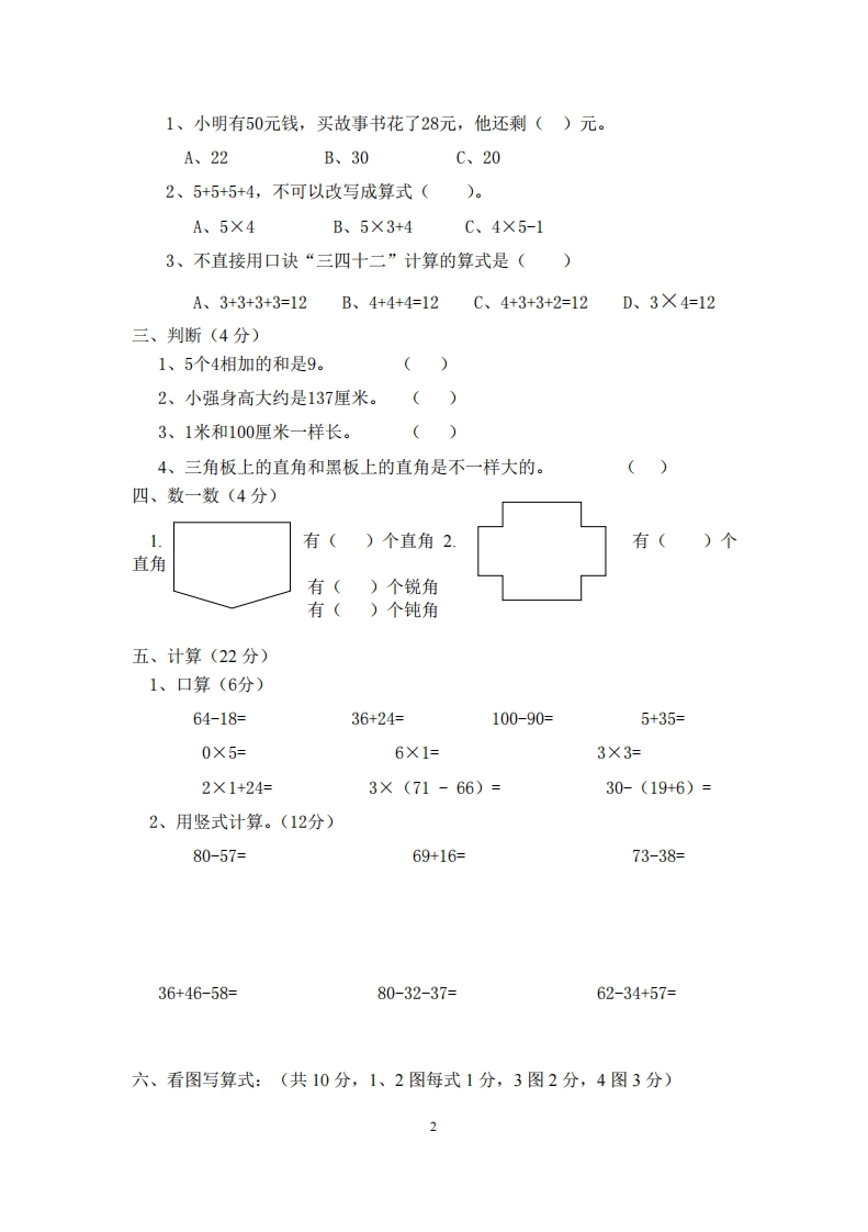 2020-2021学年上学期二年级数学期中检测试卷考试时间100分钟满分100分一、填空题。(32分,每空1分)1、78厘米+22厘米=()厘米=()米1米-40厘米=(2、量比较长的物体,一般用()作单位,量较短的物体,一般用(作单位。3、6个3相加,写成乘法算式是(),这个式子读作奶(。4、在算式4×5=20中,4和5是(),积是()。5、在()里填上“米”或“厘米”。小明身高132()小花身高1()32()新6、笔算加法和减法时都要把()对齐,都从()算起,加法个位上的数相加满(),就向()位进1,减法如果个位不够减,就从十製位(1要2元,买5个要)元。列式是(),口诀是(8、一把三角板上有()个直角。长方形有()个直角。9、在O里填上“<、>、=”或“十、一、X”3673-373×4○1120○4=164○4=16紧10、笔叮价用1霍米2341801米26小刀长()厘米蜡笔长()厘米11、3+3+3+3+3=()×():4×4-4=()×()【每一式1分】12、把口诀补充完整。()二十四)得九二、选择题(3分)