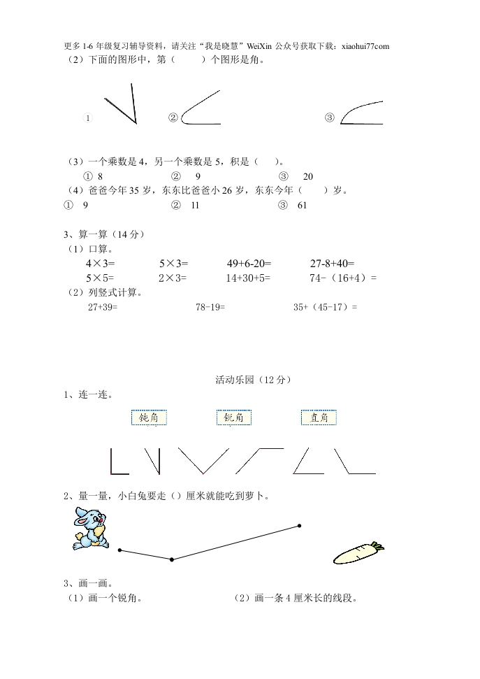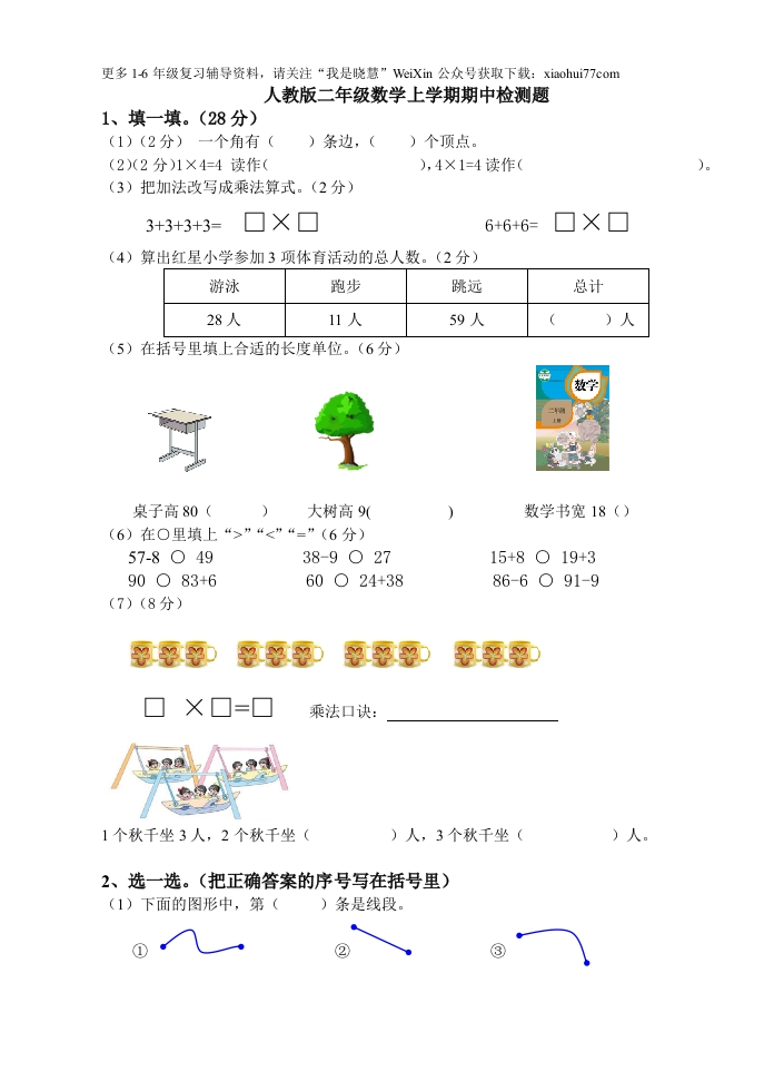 更多l6年级复习辅导资料,请关注“我是晓慧”WeiXin公众号获取下载:xiaohui7?7com人教版二年级数学上学期期中检测题1、填一填。(28分)(1)(2分)一个角有()条边,()个顶点。(2)(2分)1×4=4读作(),4×1=4读作((3)把加法改写成乘法算式。(2分)3+3+3+3=▣X口6+6+6=口×□(4)算出红星小学参加3项体育活动的总人数。(2分)游泳跑步跳远总计28人11人59人人(5)在括号里填上合适的长度单位。(6分)数学桌子高80()大树高9(数学书宽18()(6)在O里填上“>”“<”“=”(6分)57-8○4938-9○2715+8○19+390○83+660○24+3886-6○91-9(7)(8分)夏要要0要要要和要要和乘法口诀:1个秋千坐3人,2个秋千坐()人,3个秋千坐()人2、选一选。(把正确答案的序号写在括号里)(1)下面的图形中,第()条是线段。①②③
