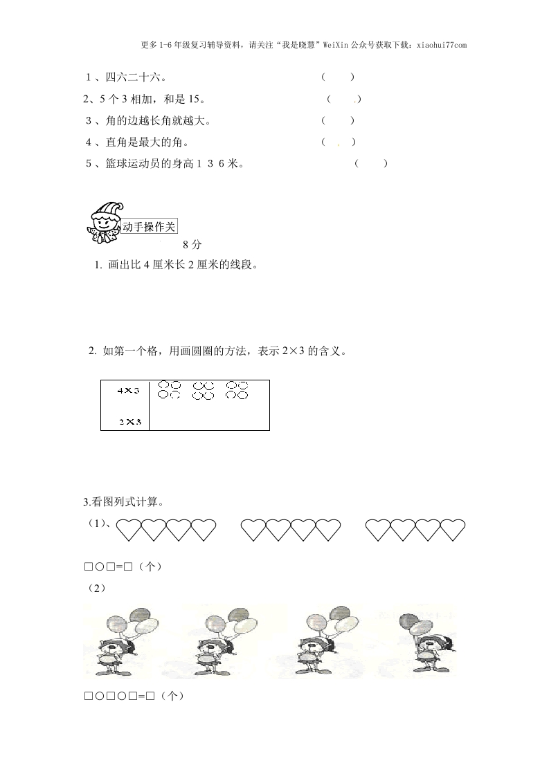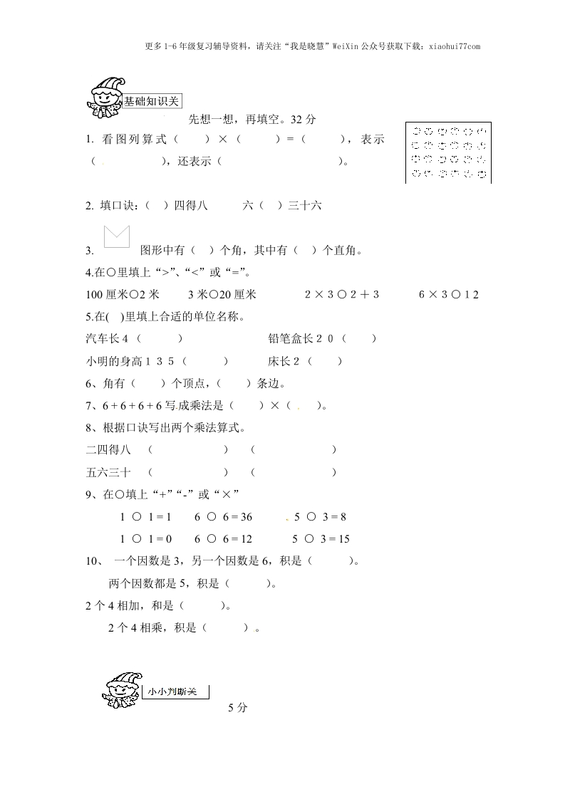 更多16年级复习辅导资料,请关注“我是晓慧”WeiXin公众号获取下载:xiaohui77com二年级数学期中测试题A卷同学们,这个学期的学习生活,已经过半。相信你有很多的收获,下面就请你用学过的知识跟着我来玩智力闯关吧!只要你仔细算,认真想,就会闯关成功的,开始吧!神机妙算关1.直接写得数。18分2×5=6×3=6×5=4×6=1×1=2×2=3X4=5×4=3+204×2=1×6=3X3=5×6=6×4=6×6=3-3=5×4=25-5=2.3X6+9L5X6-55X4+203X5-22540小燕子送信。4分3.笔算。15分27+35=71-37=34-27=32+48-59=65-43+19-45+37-20=